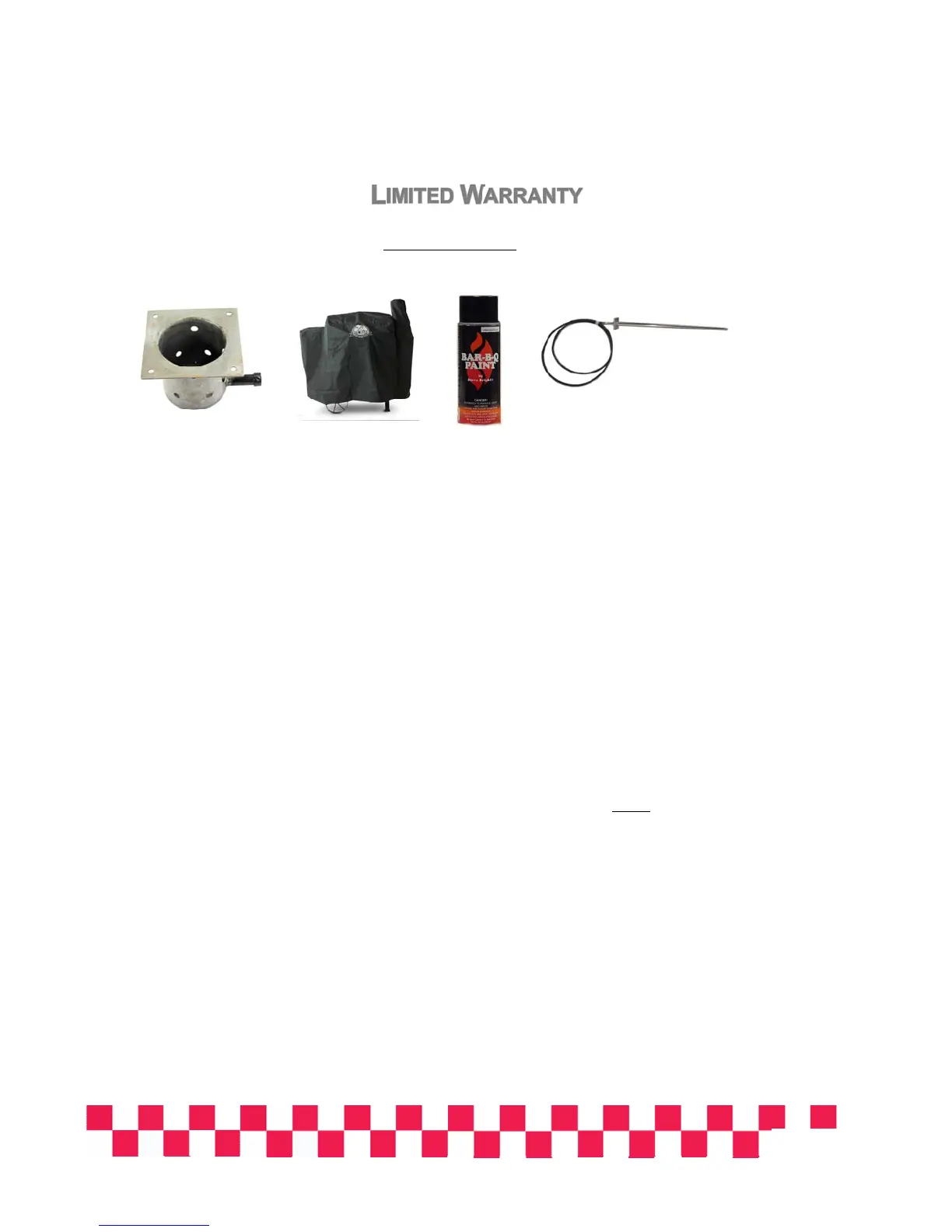 specific warranty on the paint, burn pot, grill cover, probes, all gaskets or against damage caused from corro-