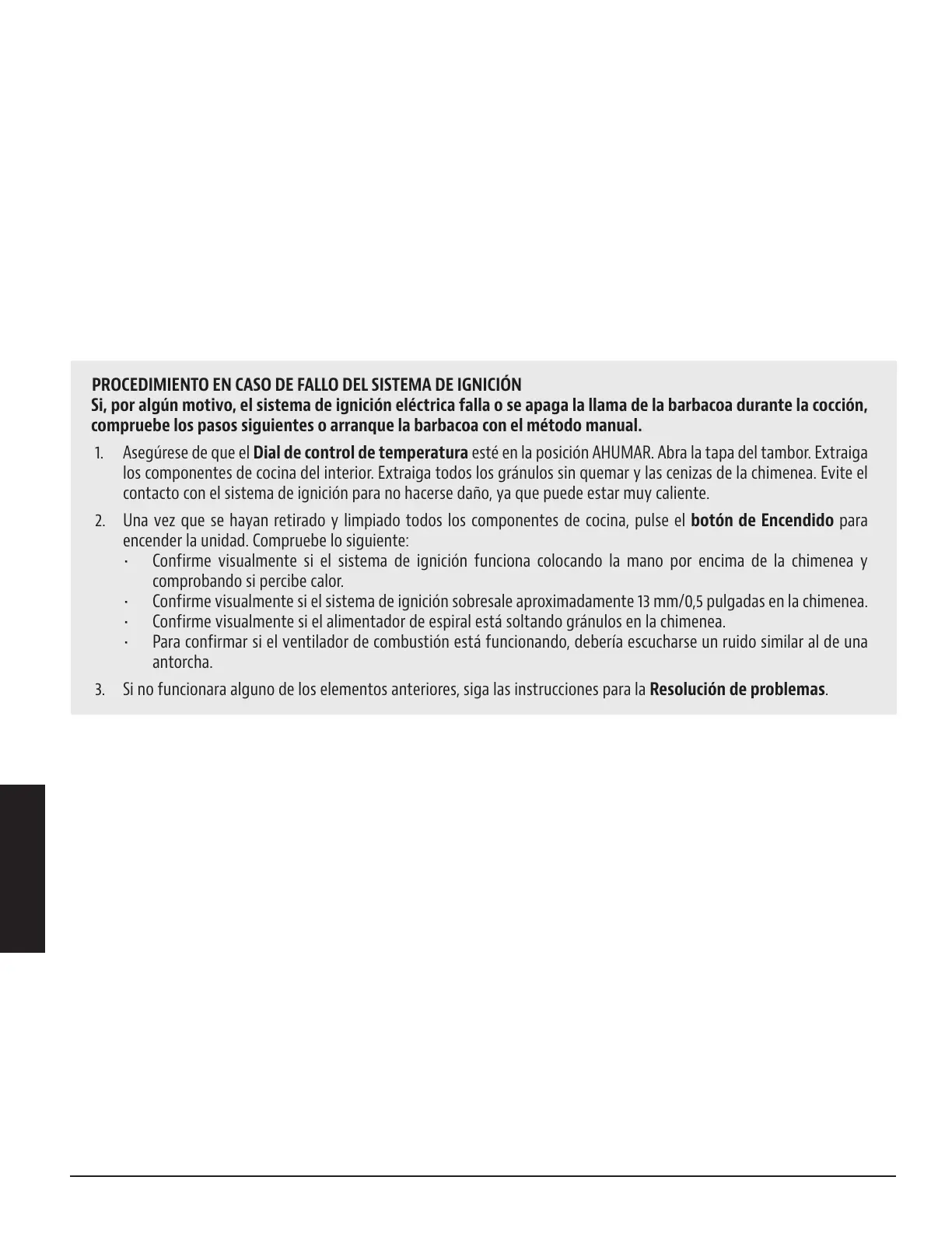 Si, por algún motivo, el sistema de ignición eléctrica falla o se apaga la llama de la barbacoa durante la cocción,