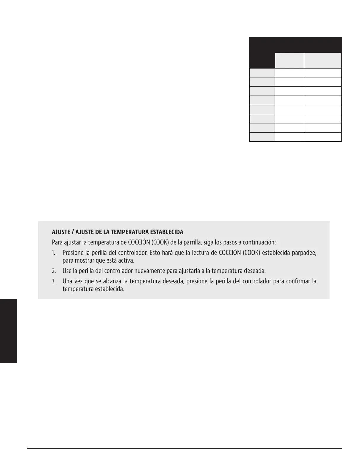 Para ajustar la temperatura de COCCIÓN (COOK) de la parrilla, siga los pasos a continuación: