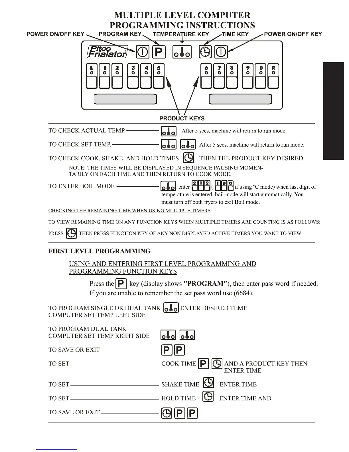 Pitco SGH50 - COMPUTER CONTROL PROGRAMMING INSTRUCTIONS; FIRST LEVEL PROGRAMMING