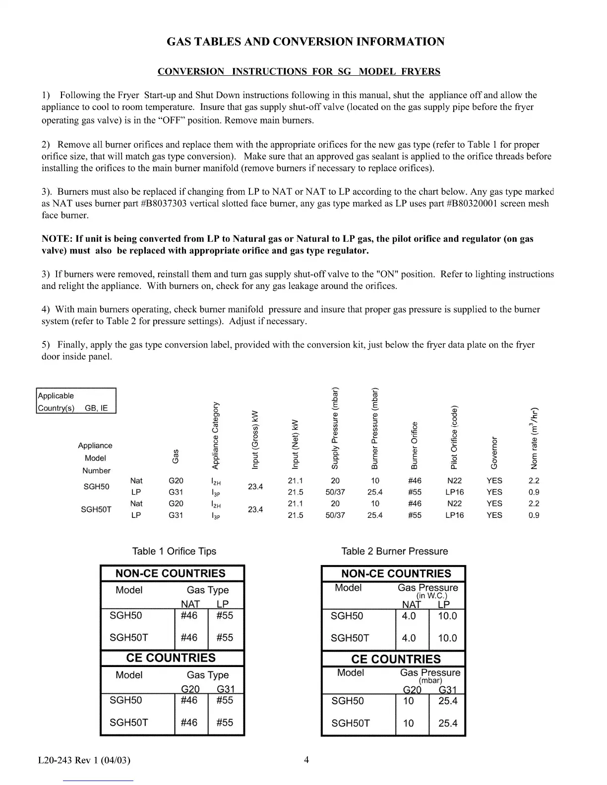 Pitco SGH50 - GAS TABLES AND CONVERSION INFORMATION; CONVERSION INSTRUCTIONS FOR SG MODEL FRYERS
