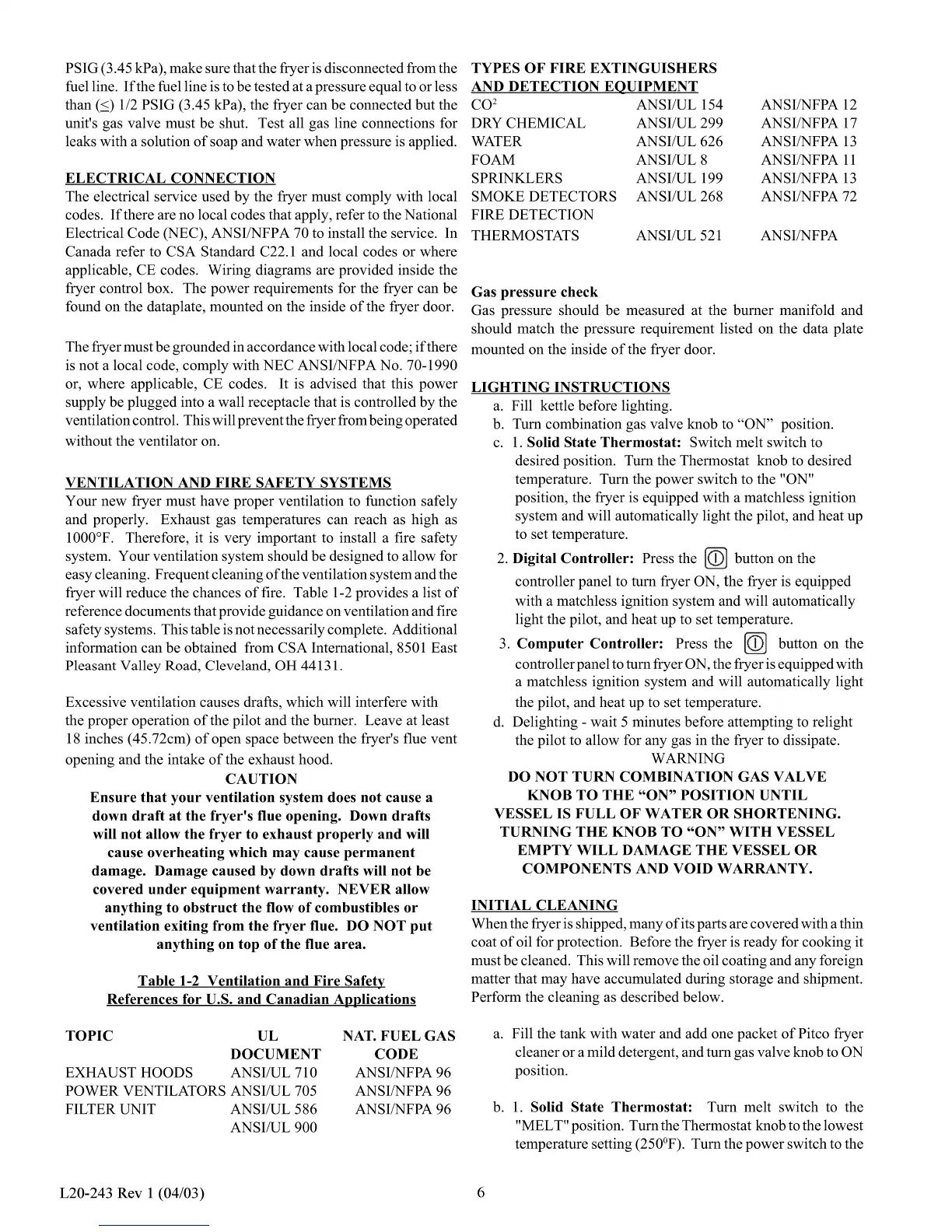 Pitco SGH50 - ELECTRICAL CONNECTION; VENTILATION AND FIRE SAFETY SYSTEMS; LIGHTING INSTRUCTIONS