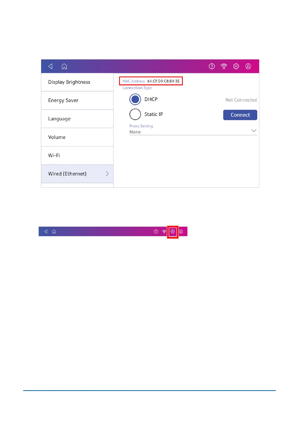 2. Tap Wired (Ethernet). The MAC address is present at the top of the screen.