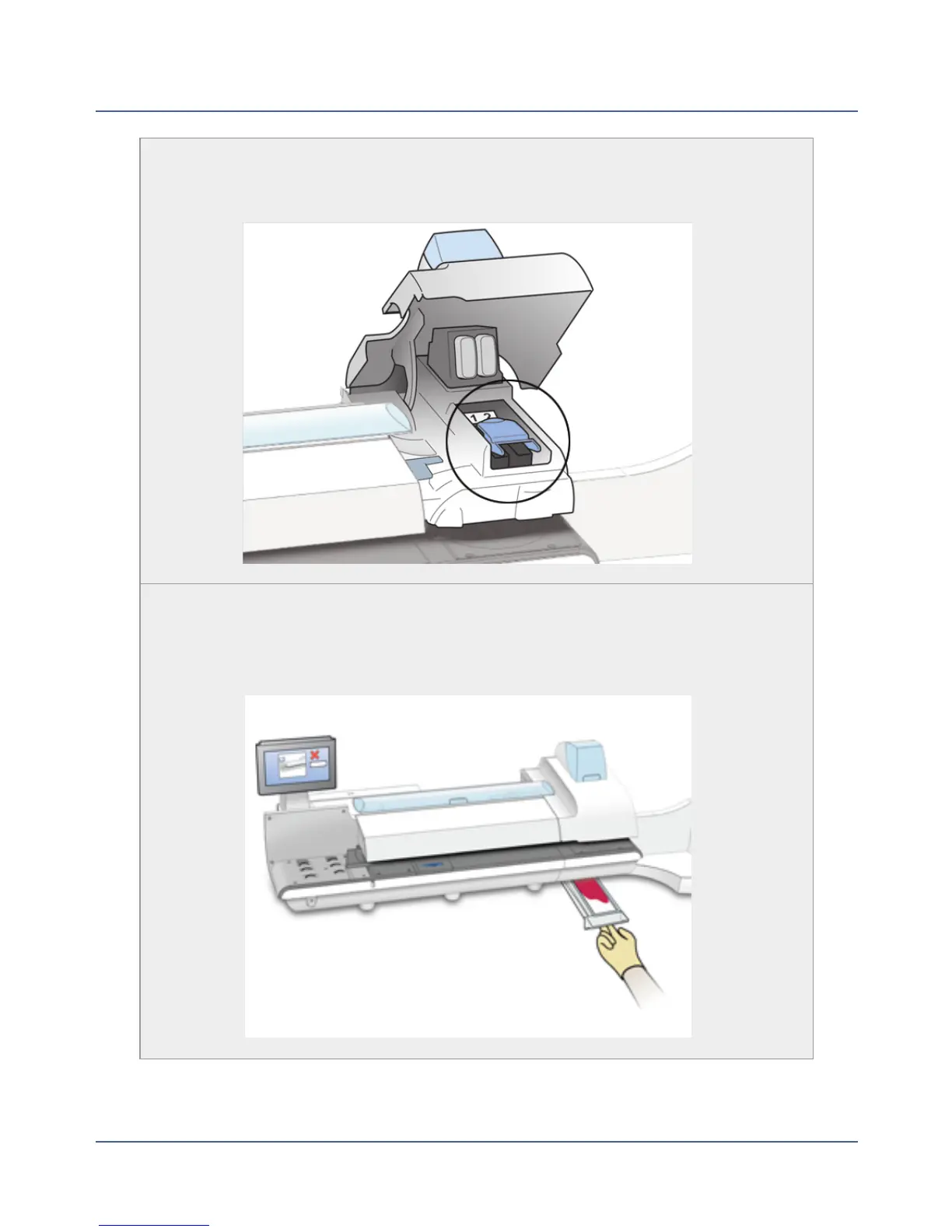 Ink is deposited in the waste ink tray during the print head cleaning process.