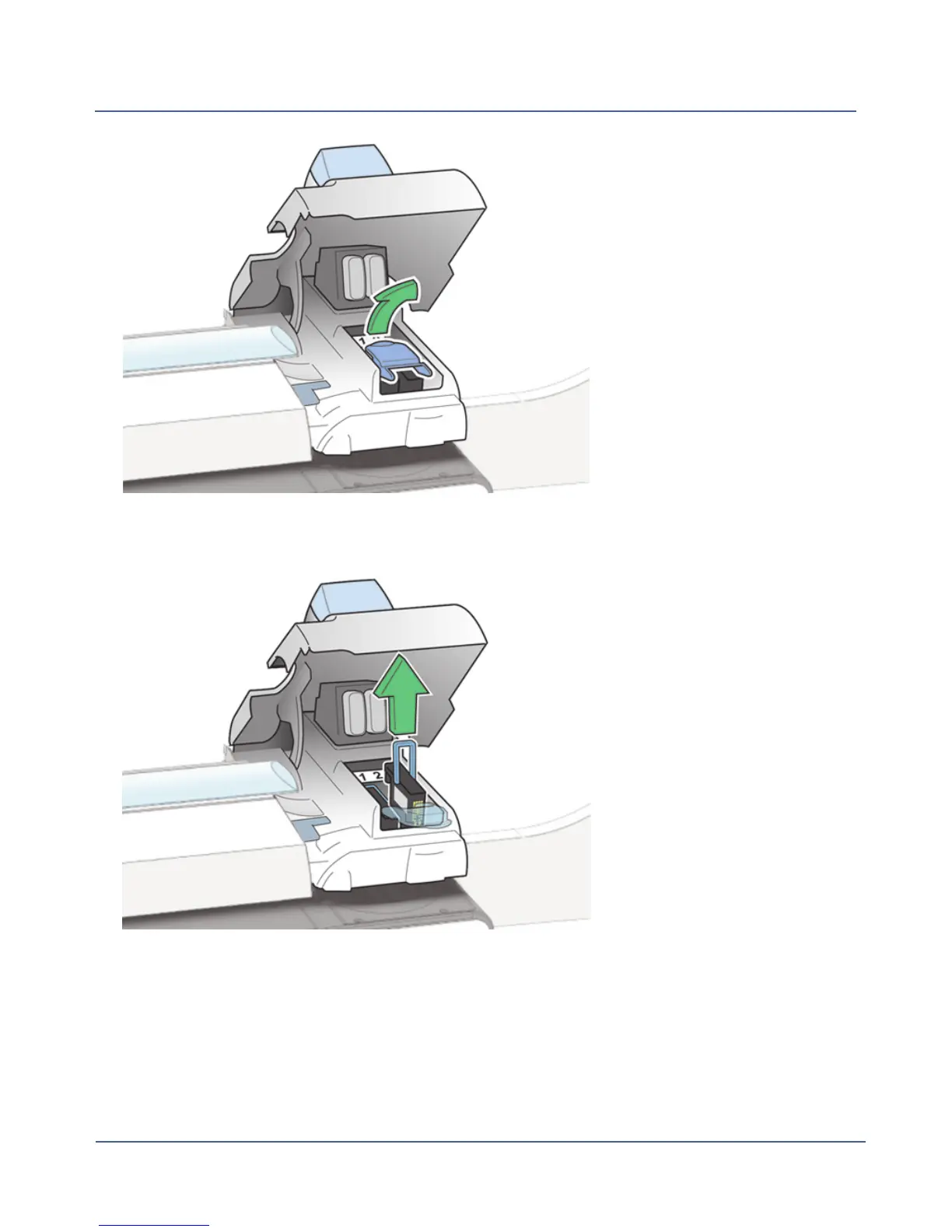 Lift the blue print head handle up to a vertical position and then lift the print head straight