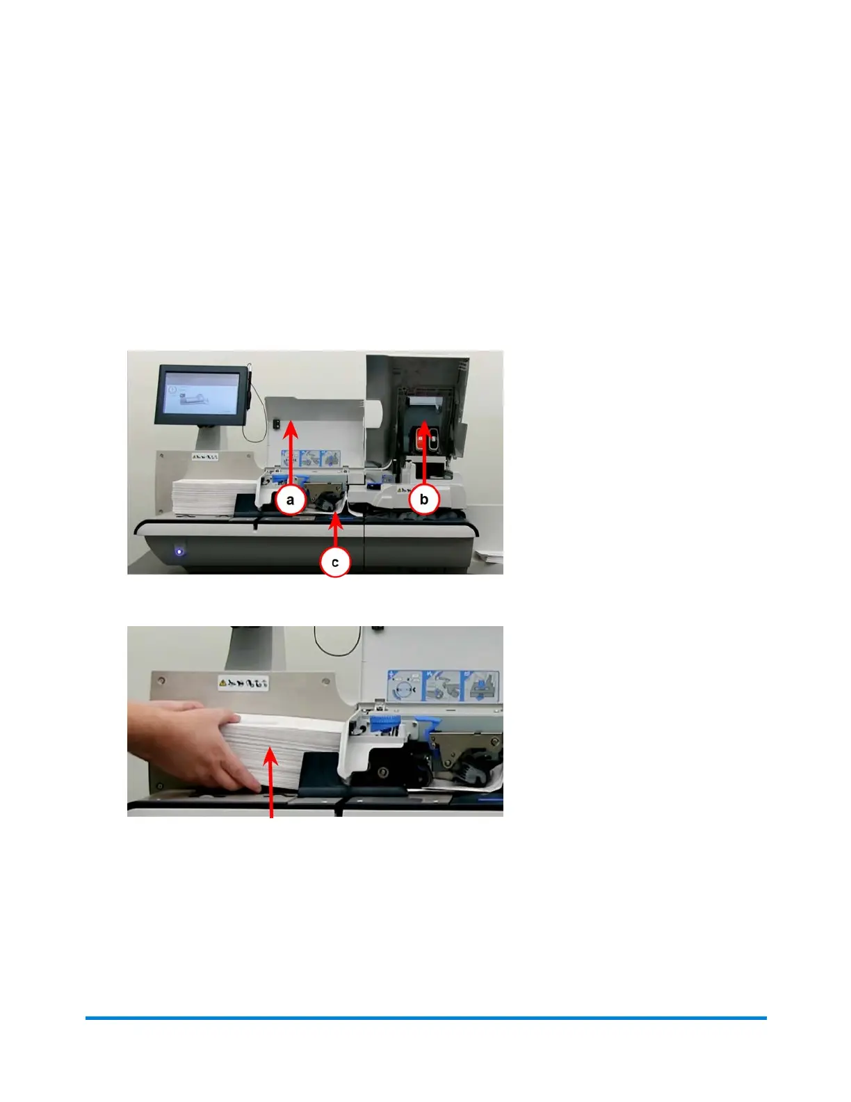 1. Lift the (a) feed cover and the (b) printer cover and locate the stoppage (c).