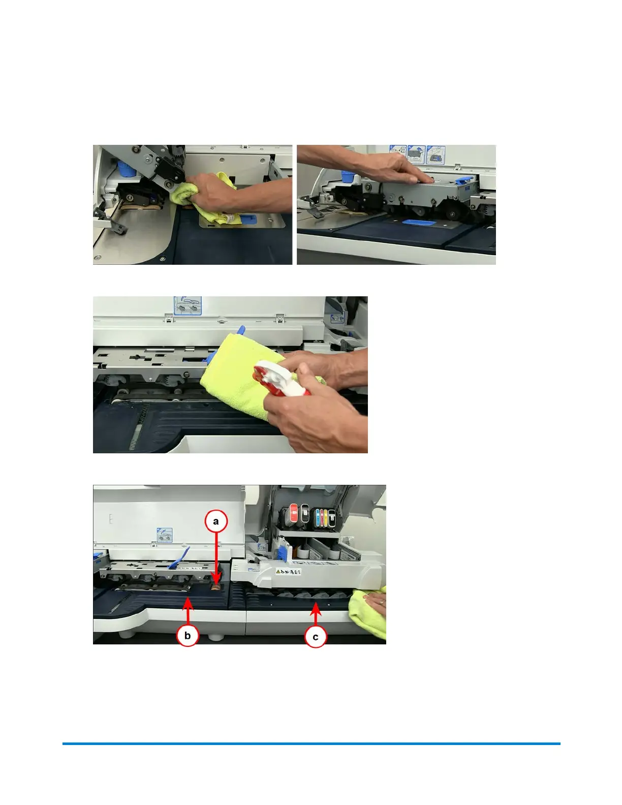 10. Clean the (a) printer entrance roller and the (b) W-O-W and (c) printer decks.