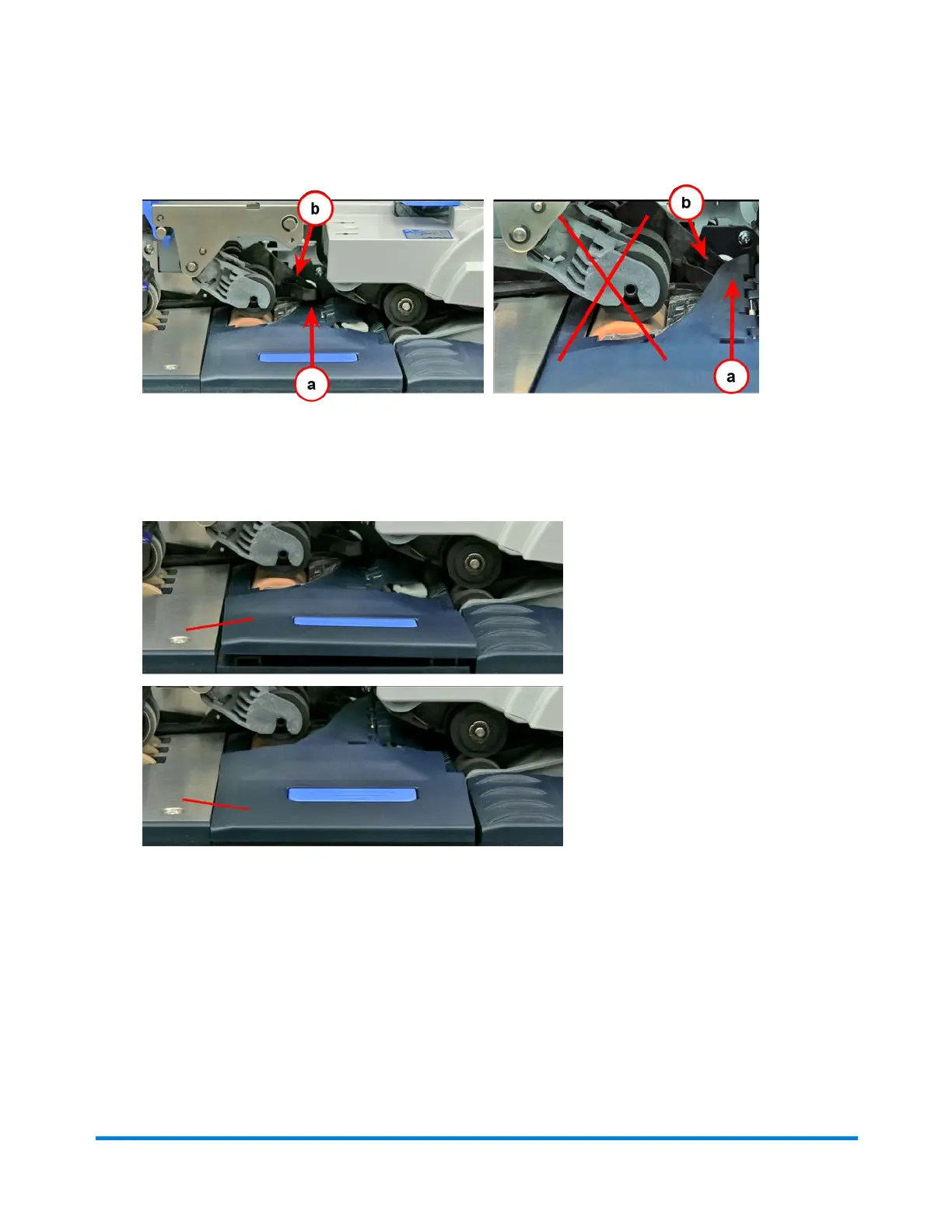 (a) Stripper on moistener pad assembly is under the (b) mail hold down assembly