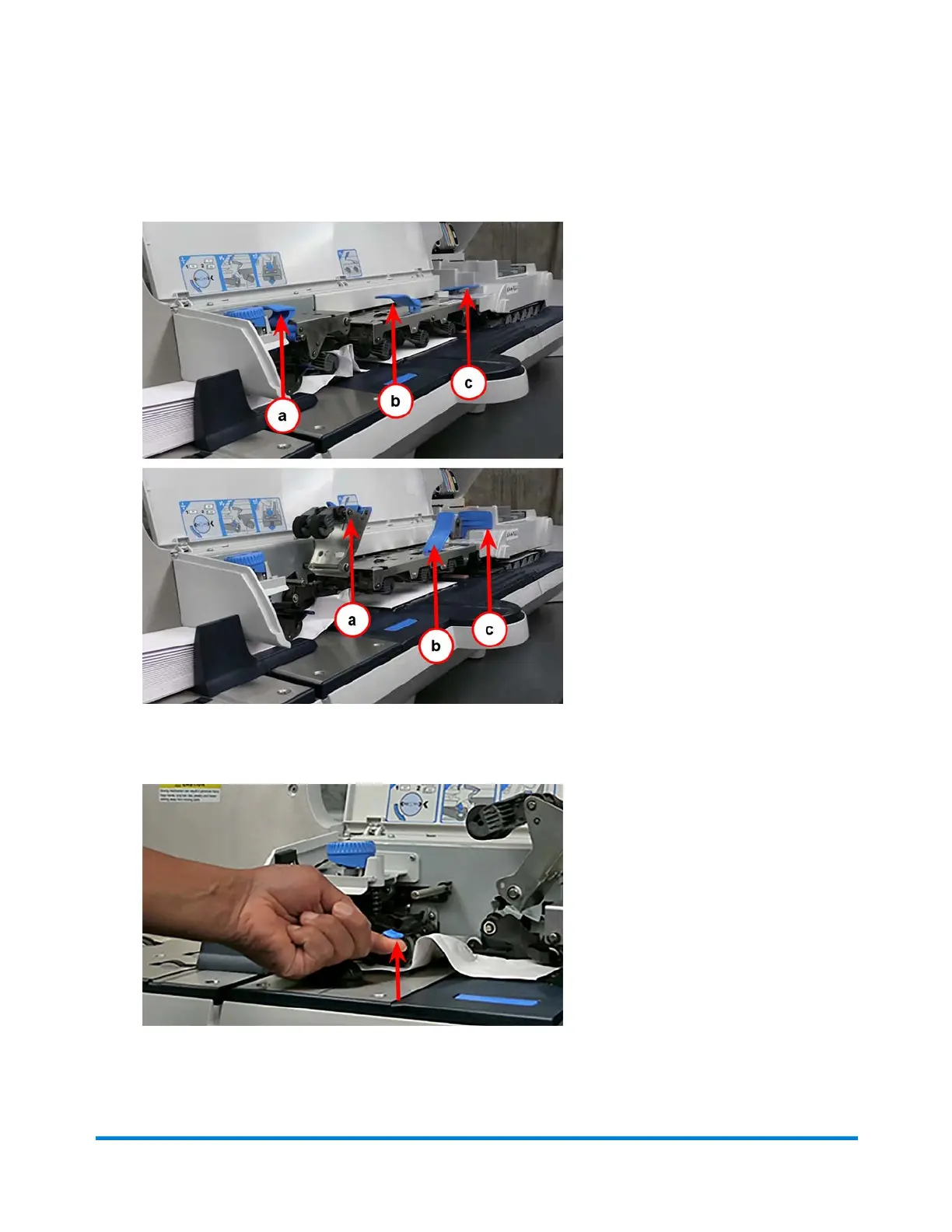 2. Pull up on the (a) top release lever, the (b) W-O-W transport release lever, and the (c) printer