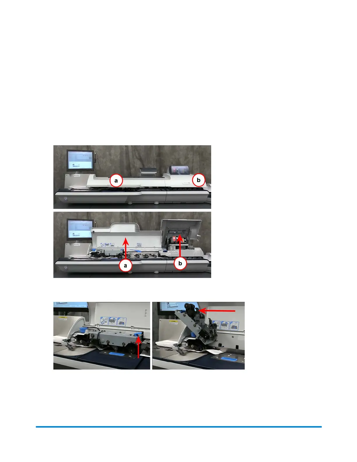 1. Lift the (a) feeder W-O-W transport cover and the (b) printer cover.