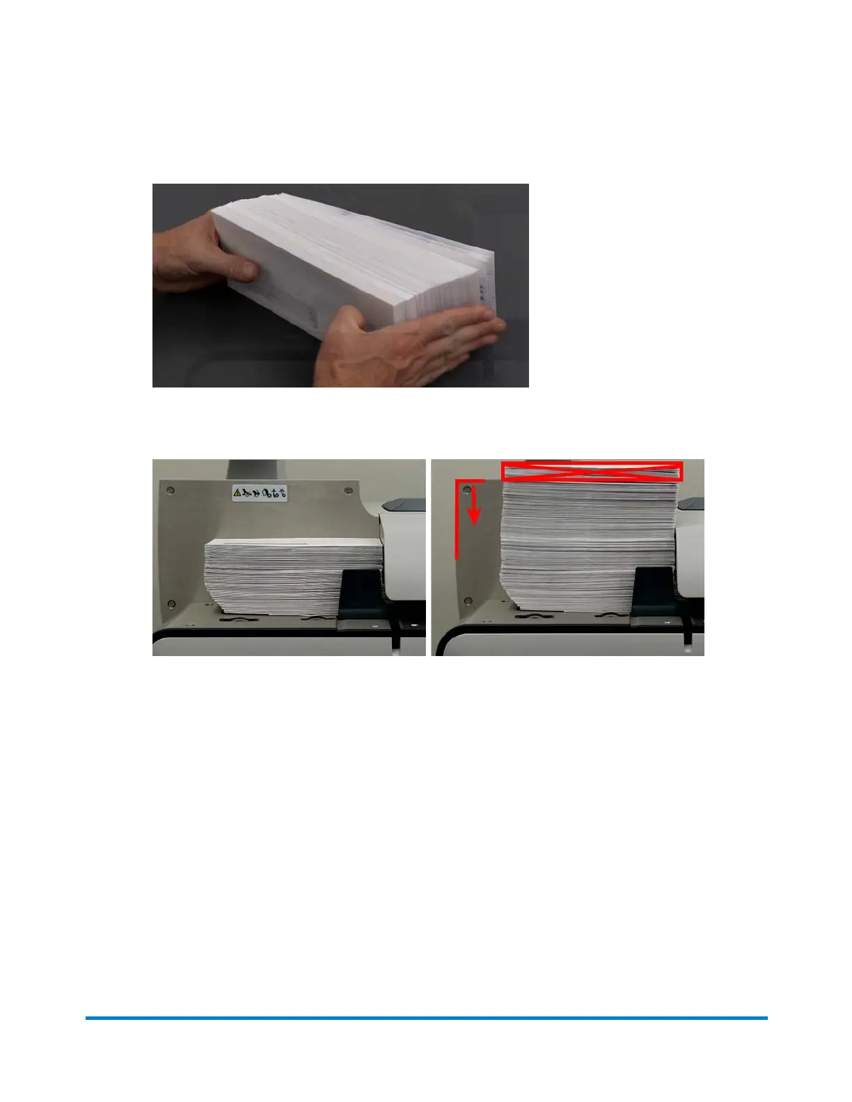 e. Place the stack on the feed deck with the envelope flaps down and against the rear wall. Make