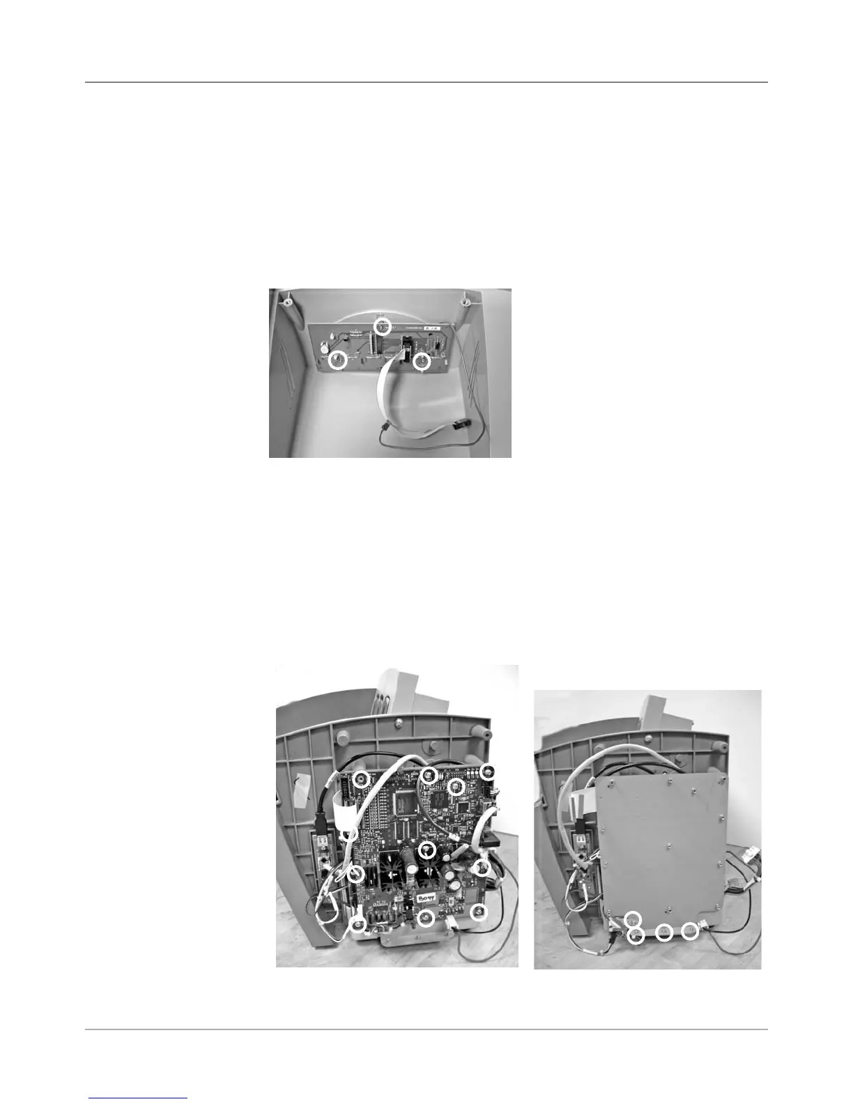 3. Remove 11 phlllips screws (circled in left photo below) holding board to