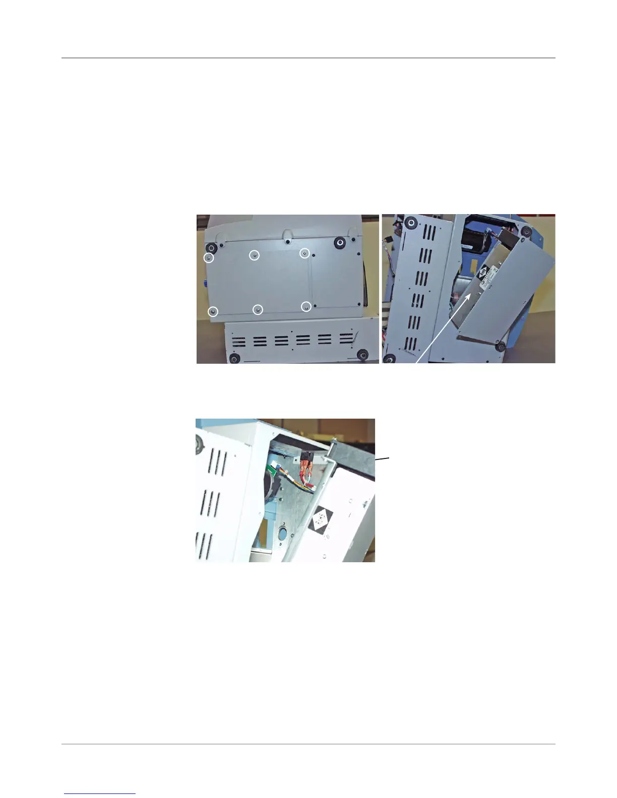 4. Turn the printer onto the side. Unfasten the six screws securing the pow-