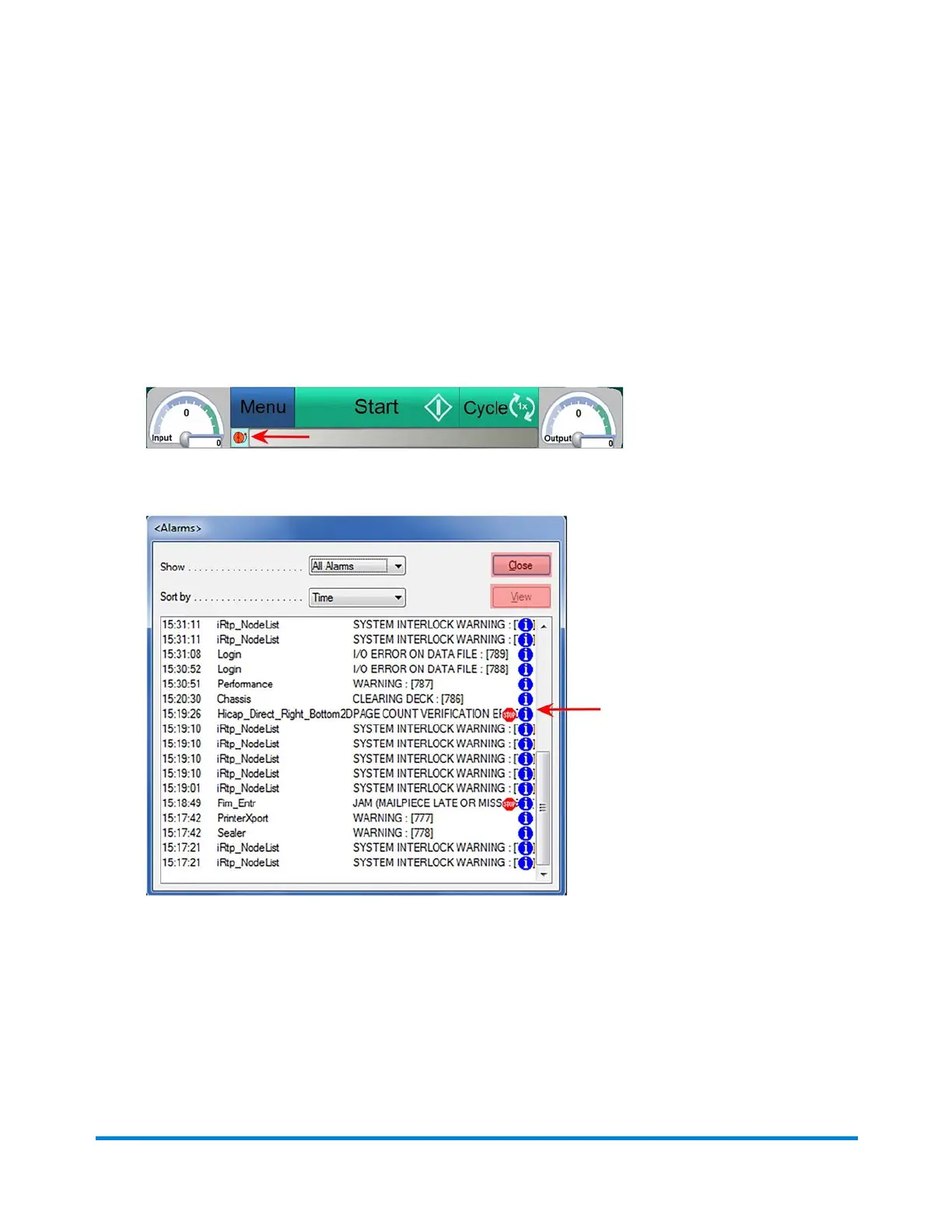 Alarm History - (Alarms with a "stop sign" next to them indicate events that stopped the inserter)