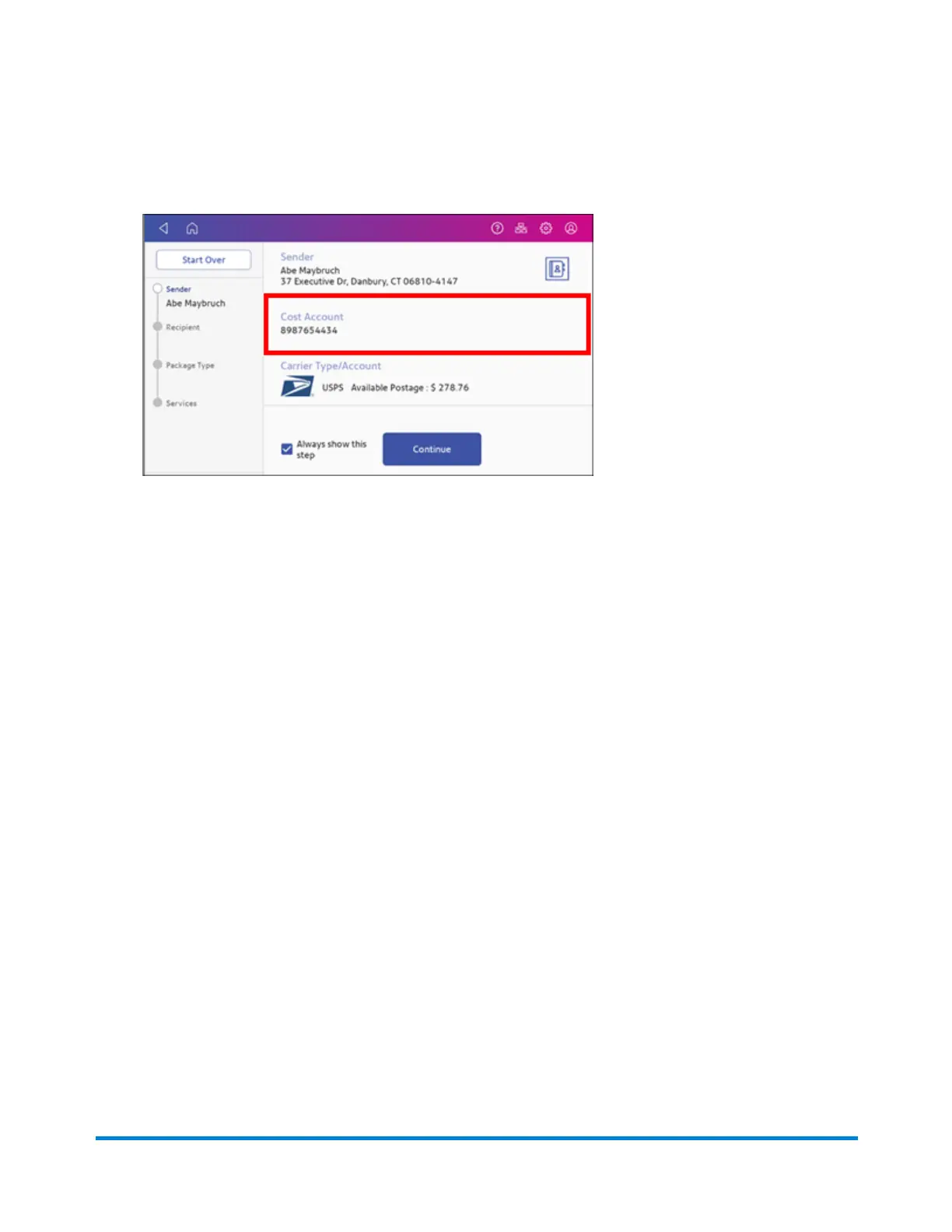 4. If cost accounts are enabled, you must select an account. If an account is already present, verify