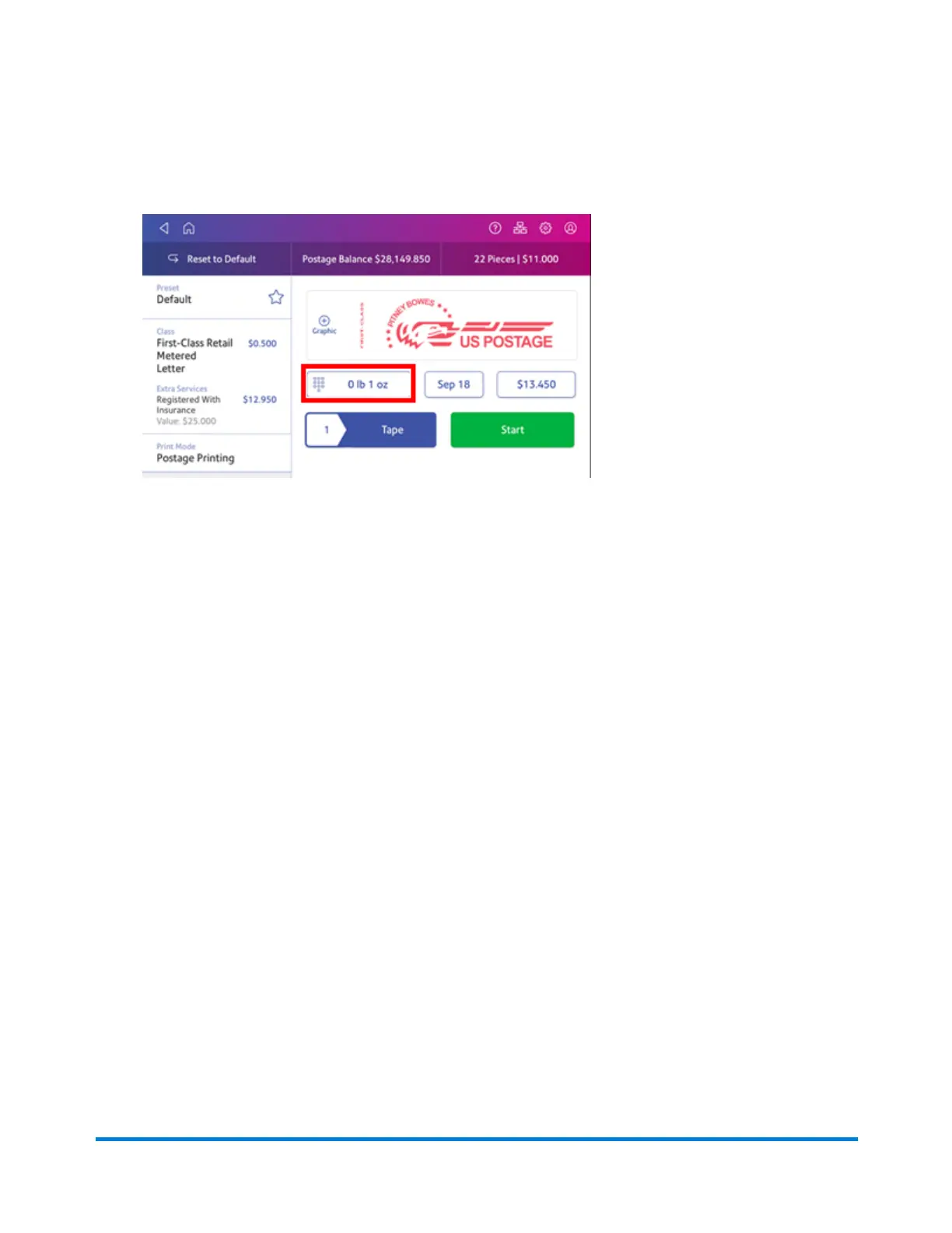 3. Place the mailpiece on the scale. The weight appears. You can also weigh the mailpiece using