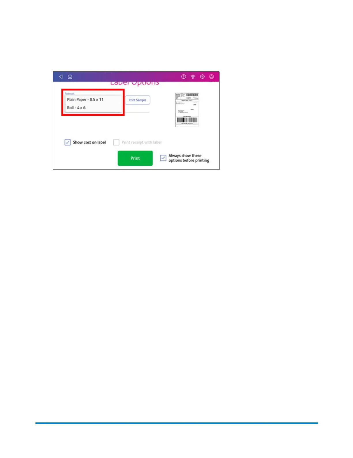 15. On the Label Options screen, tap Format and select the printer format.