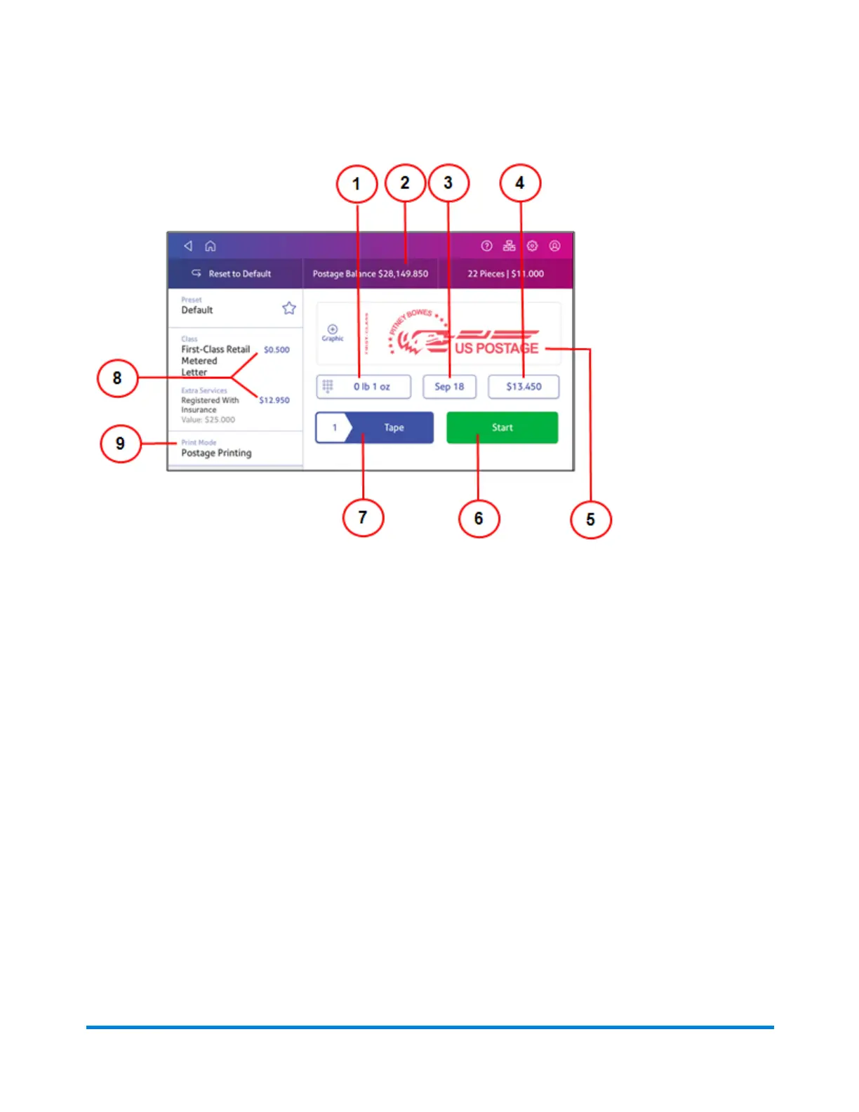 6. Tap Start to begin feeding and printing postage on the envelopes loaded on the feed deck. The
