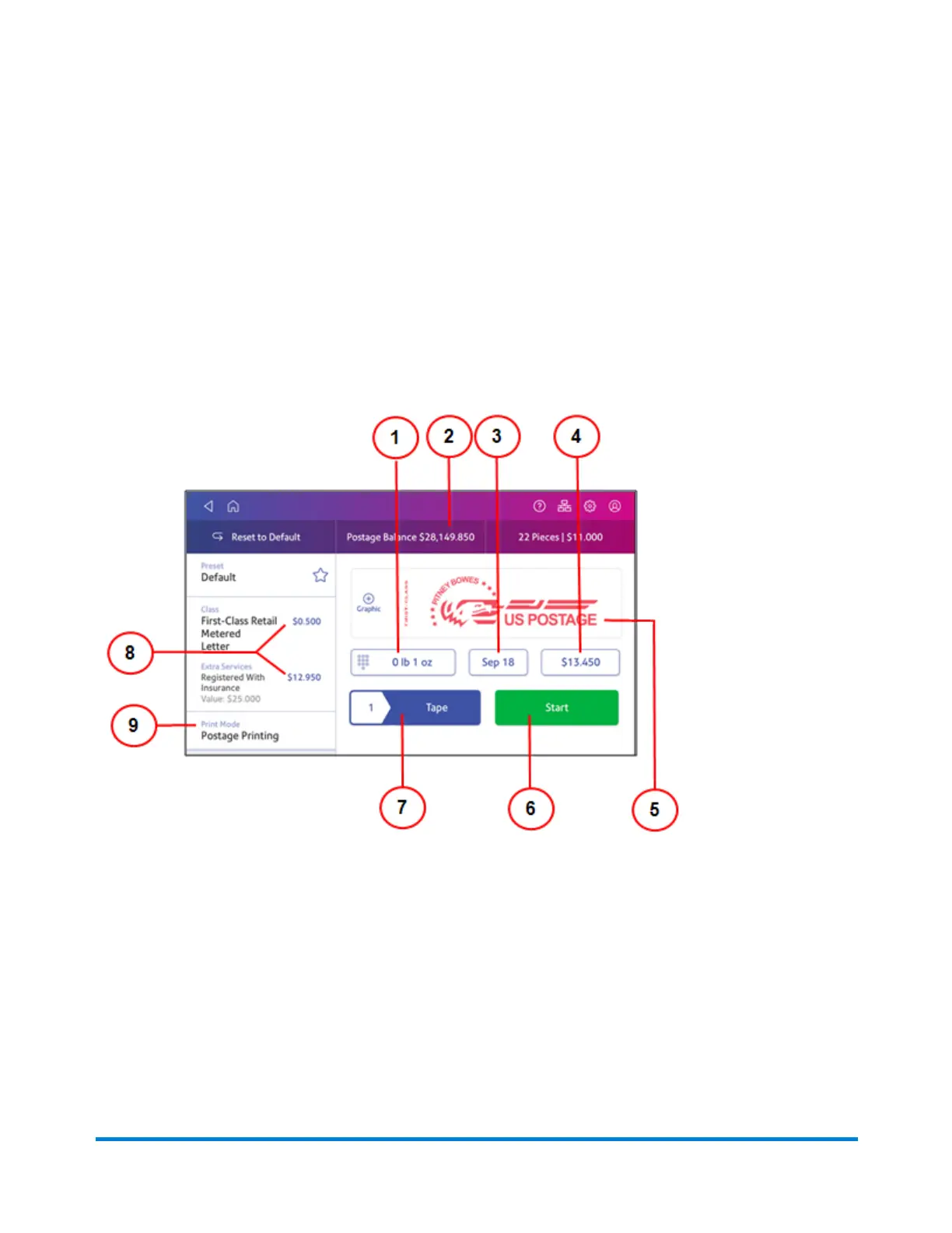 6. Tap Start to begin feeding and printing postage on the envelopes loaded on the feed deck. The