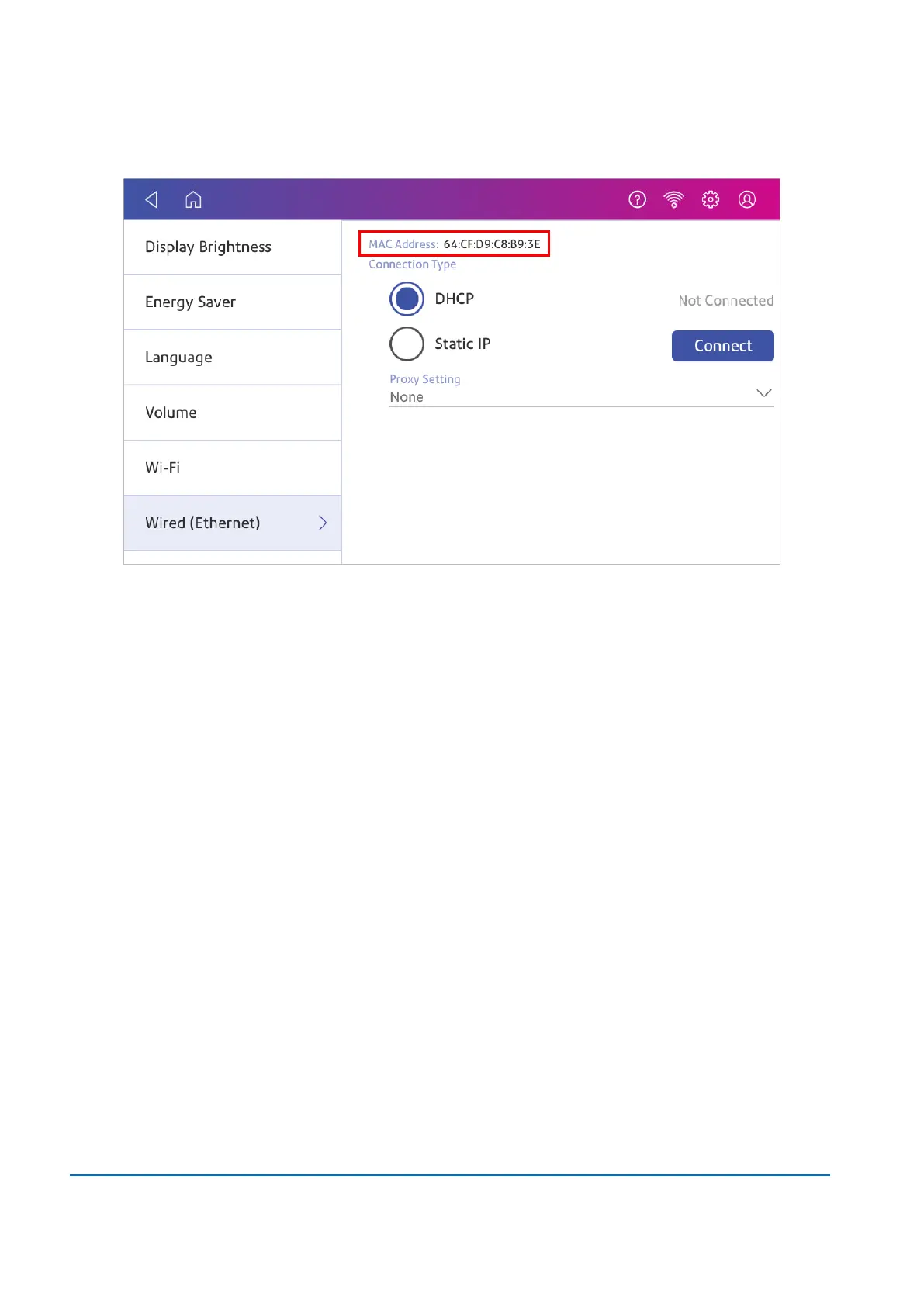 2. Tap Wired (Ethernet). The MAC address is present at the top of the screen.