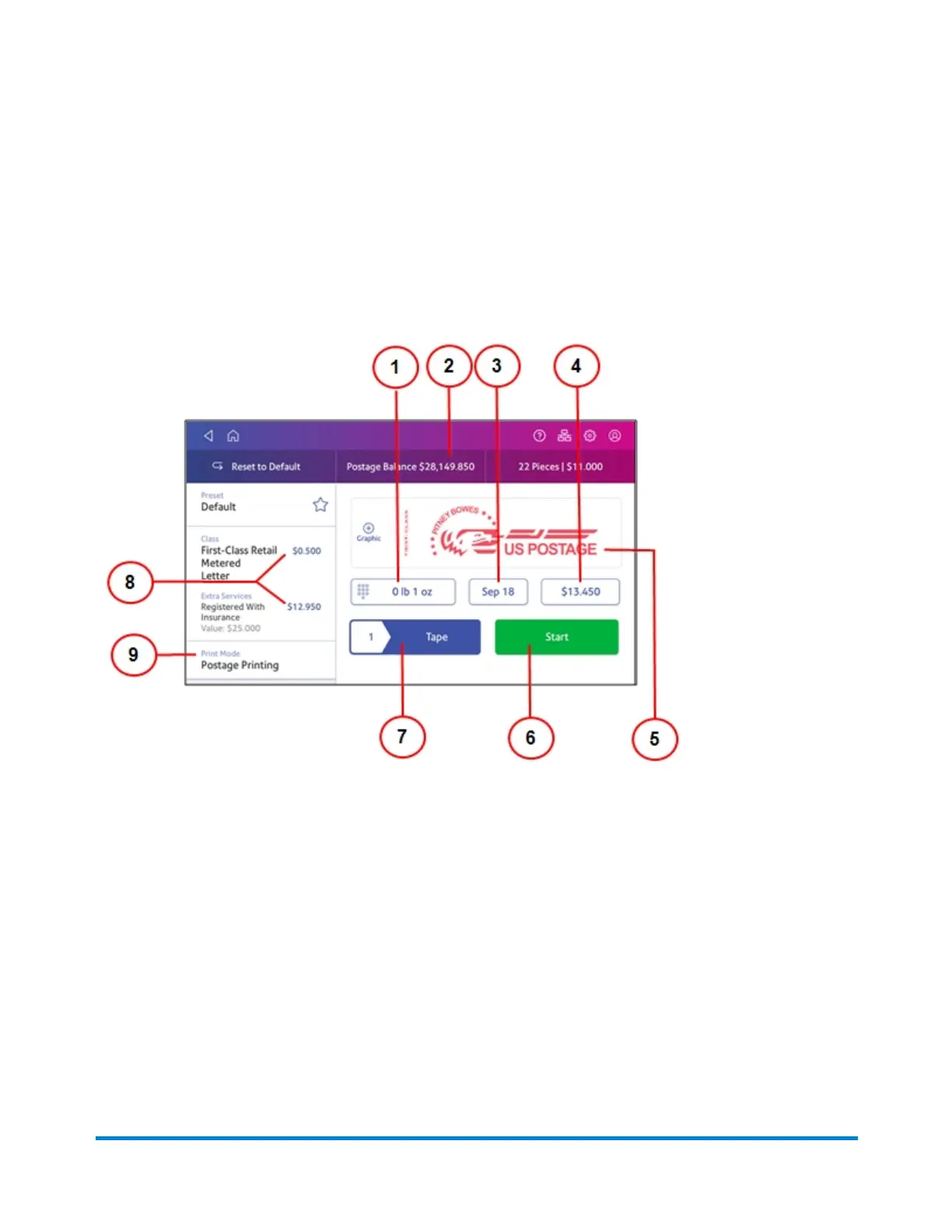 6. Tap Start to begin feeding and printing postage on the envelopes loaded on the feed deck. The