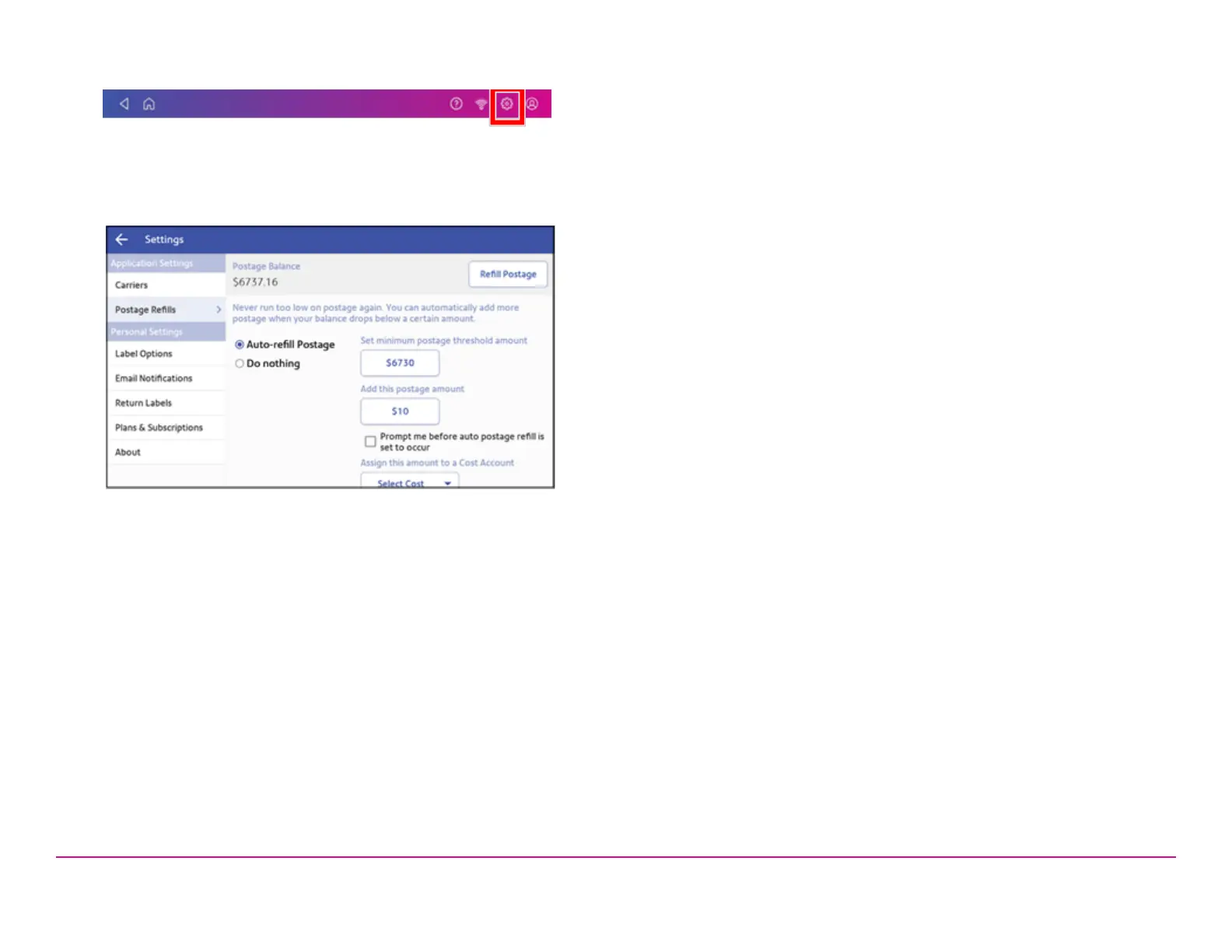3. Tap Shipping Refills.The shipping label postage refill screen