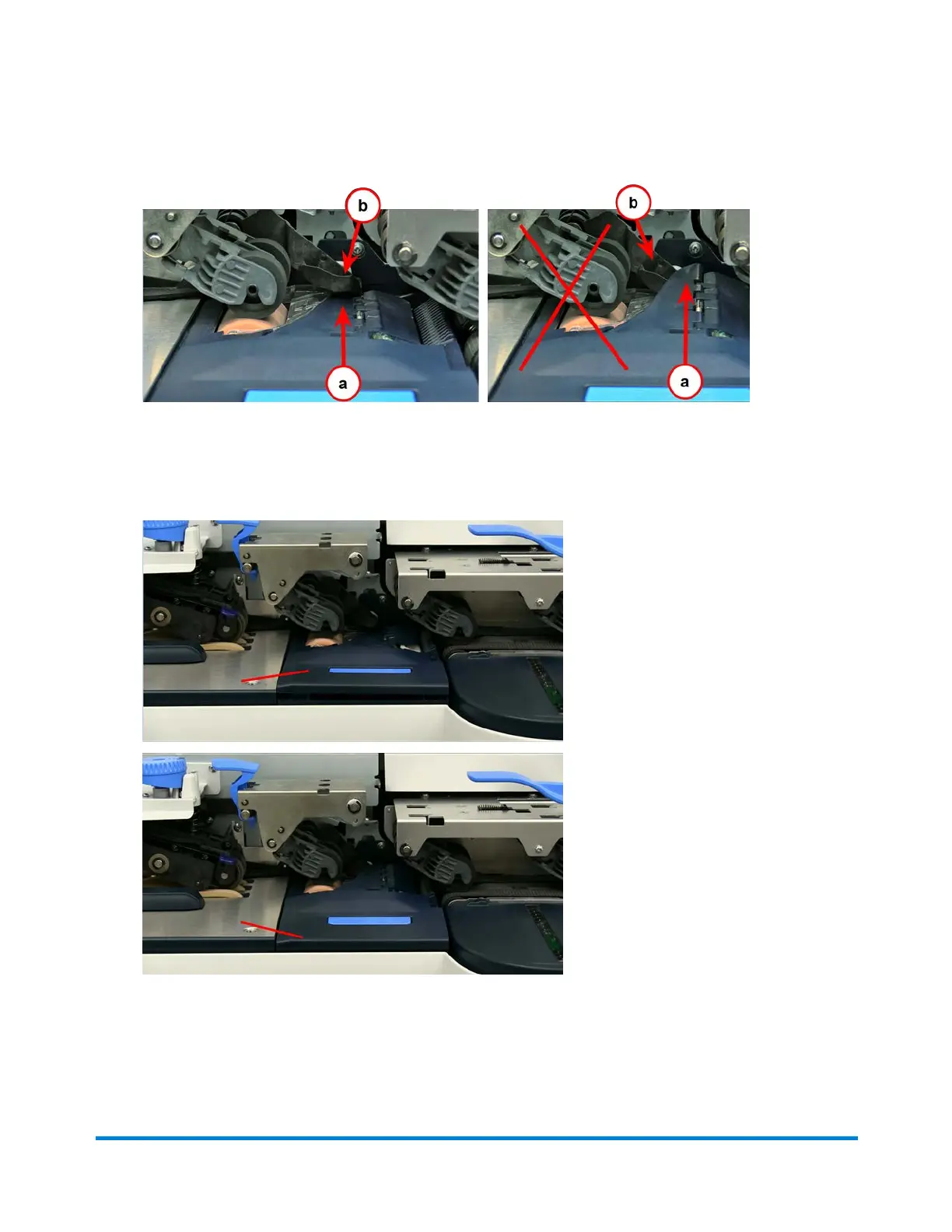 (a) Stripper on moistener pad assembly must be under the (b) mail hold down assembly