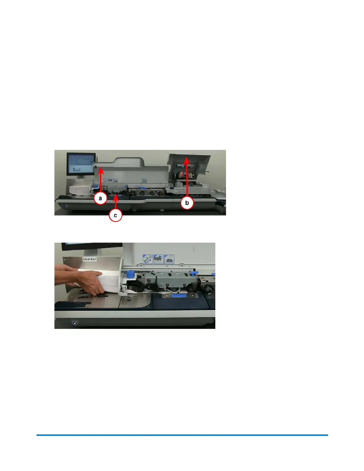 1. Lift the (a) feed cover and the (b) printer cover and locate the stoppage (c).