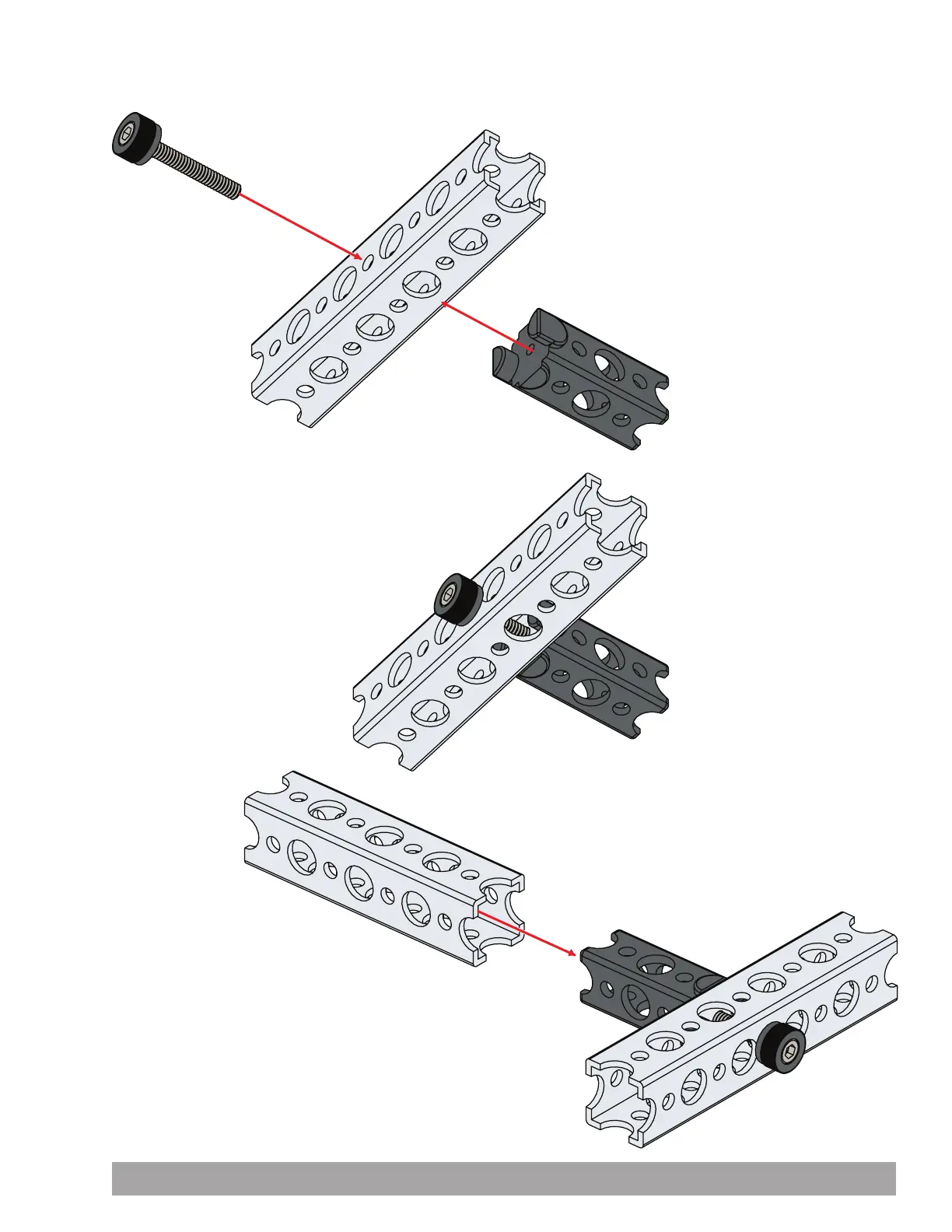 Beam end connectors, straight block beam connectors, and 90-degree cross block connectors are secured using a