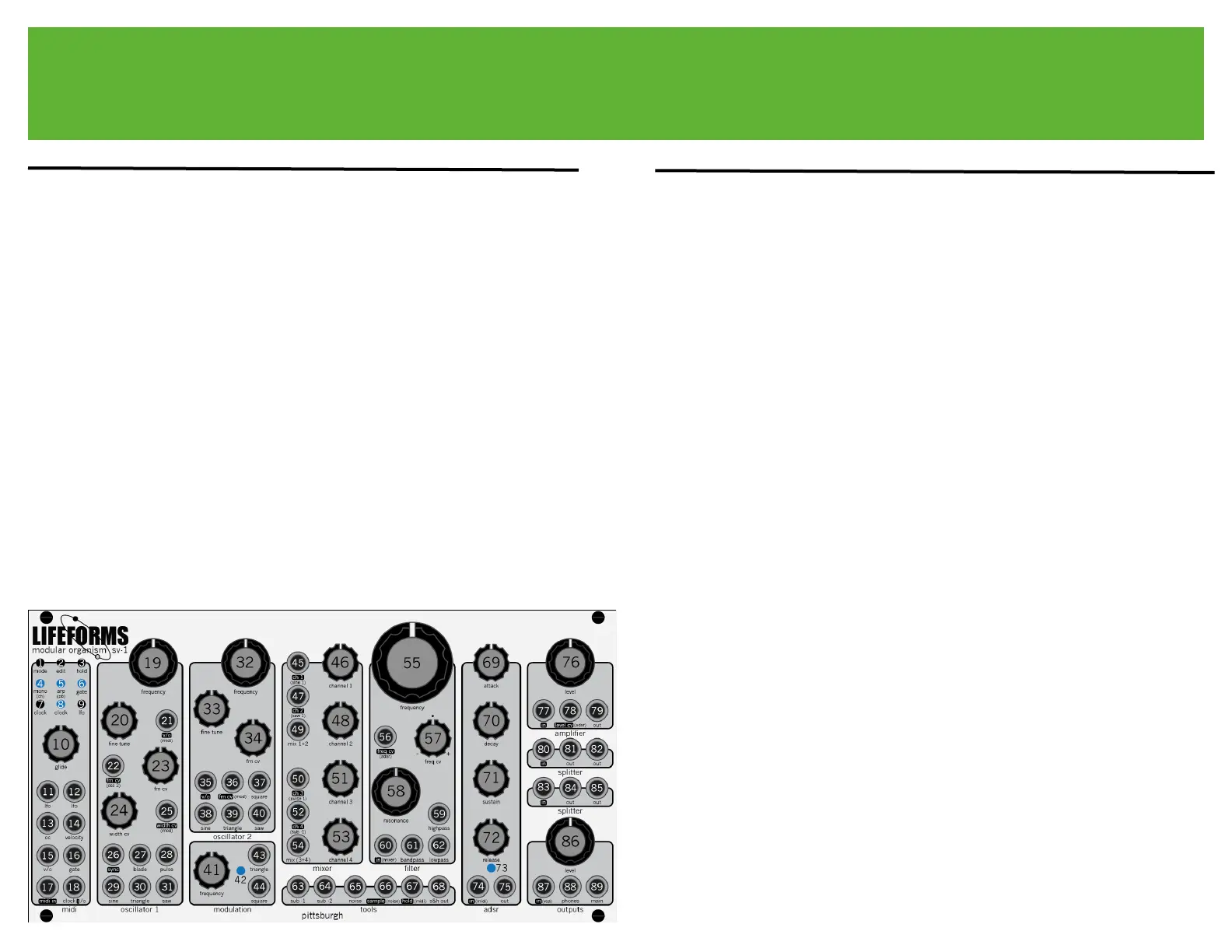 25. oscillator 1 width cv input jack - blade & pulse width modulation input."