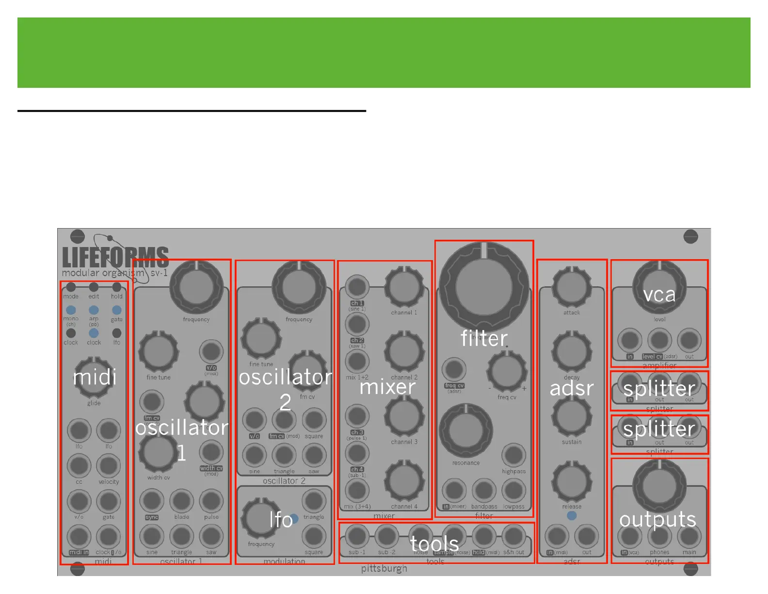 The Lifeforms SV-1 is organized into 12 independent sections. Midi, oscillator 1,