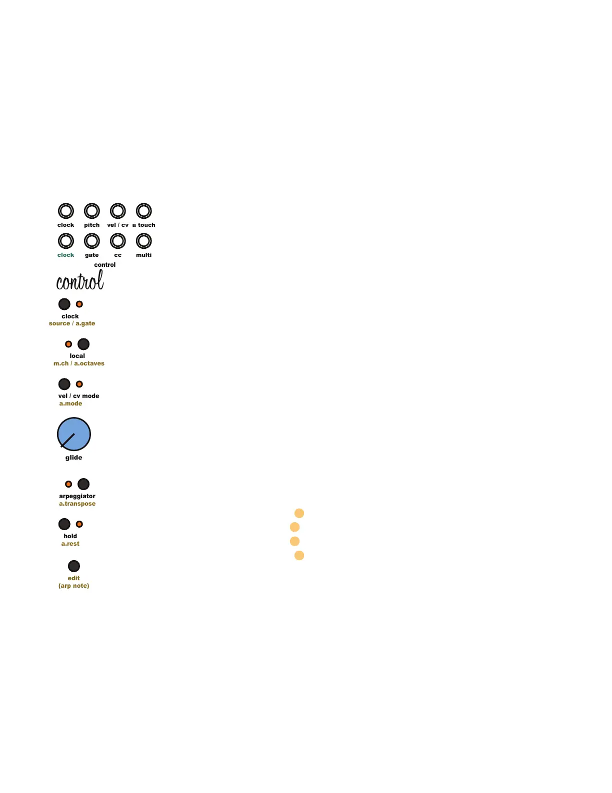 The Control module utilizes 4 clock sources: internal tap tempo, external MIDI, external gate,