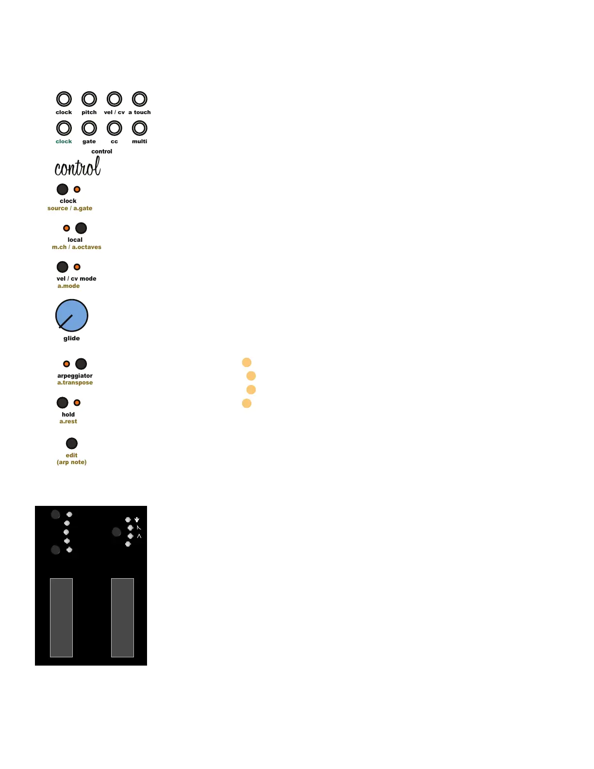 4. Random Voltage - Random voltage generator. The MOD-WHEEL adjusts the amplitude of the