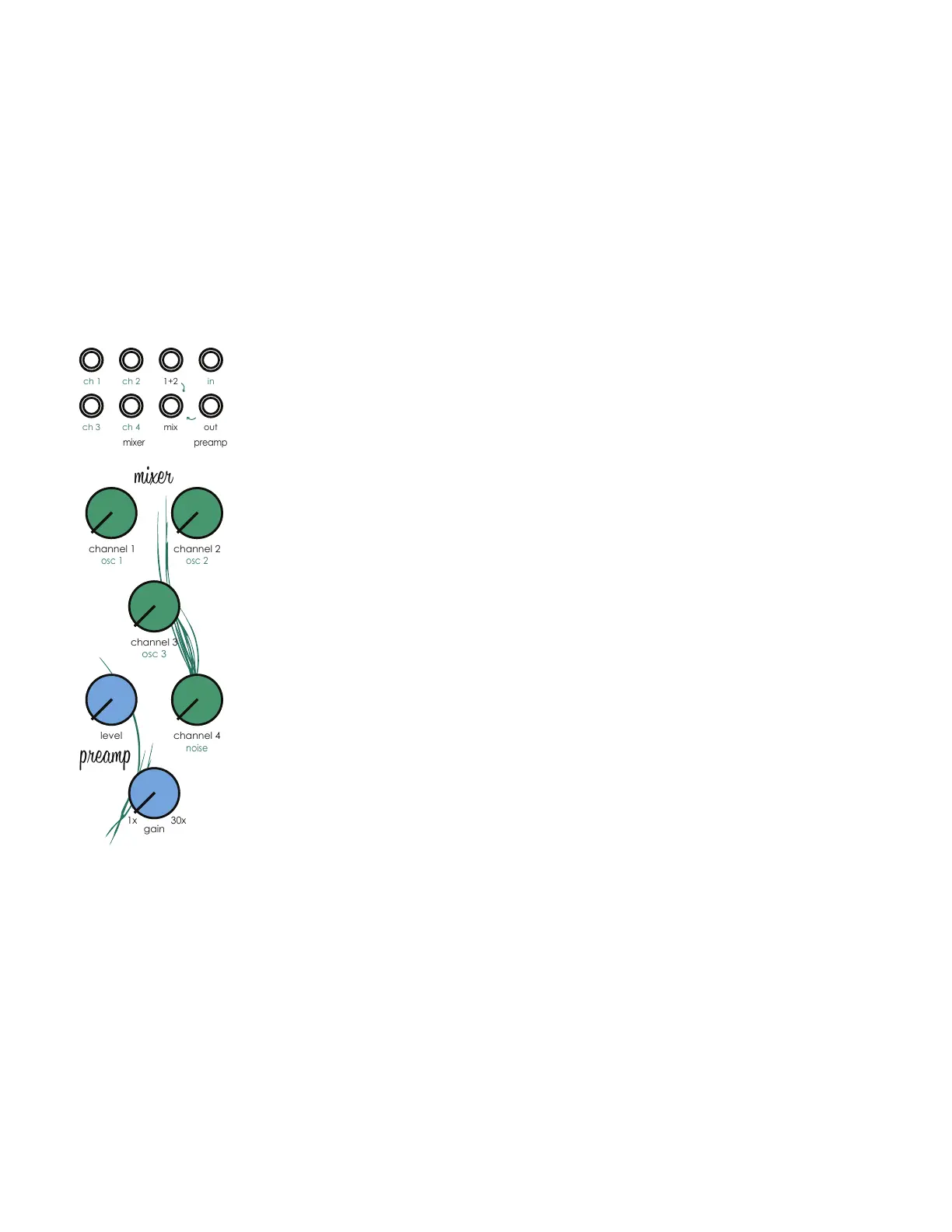 normaled to the oscillator 2 output. Plugging a patch cable into the [Mixer Channel 2 Input