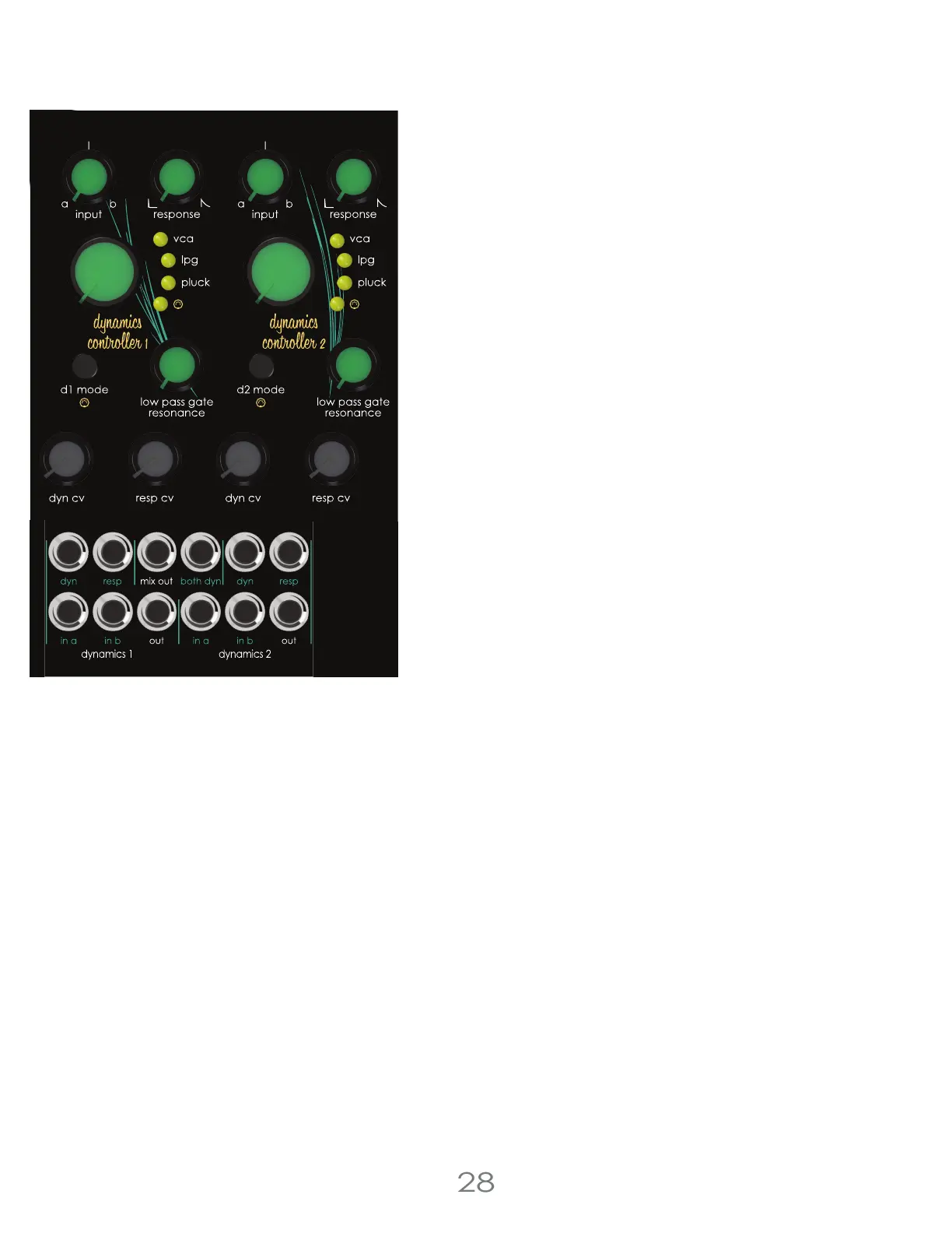 The Dynamics Controllers offer 3 distinct audio processing modes. VCA, low pass gate, and plucked low pass gate. Each