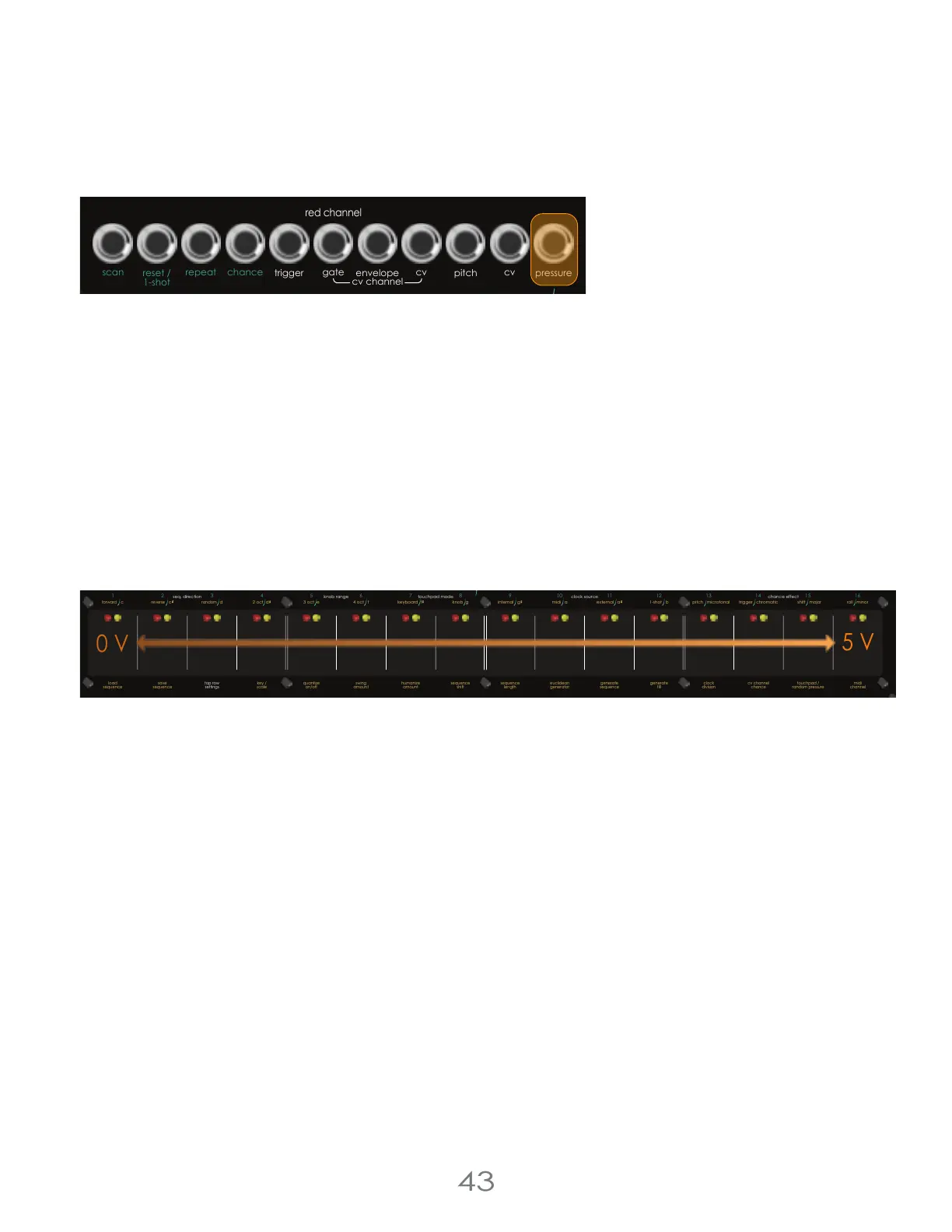 There are two [PRESSURE OUTPUTS] on the Touch Control, one per Channel. These pressure outputs are a 0-5 Volt CV