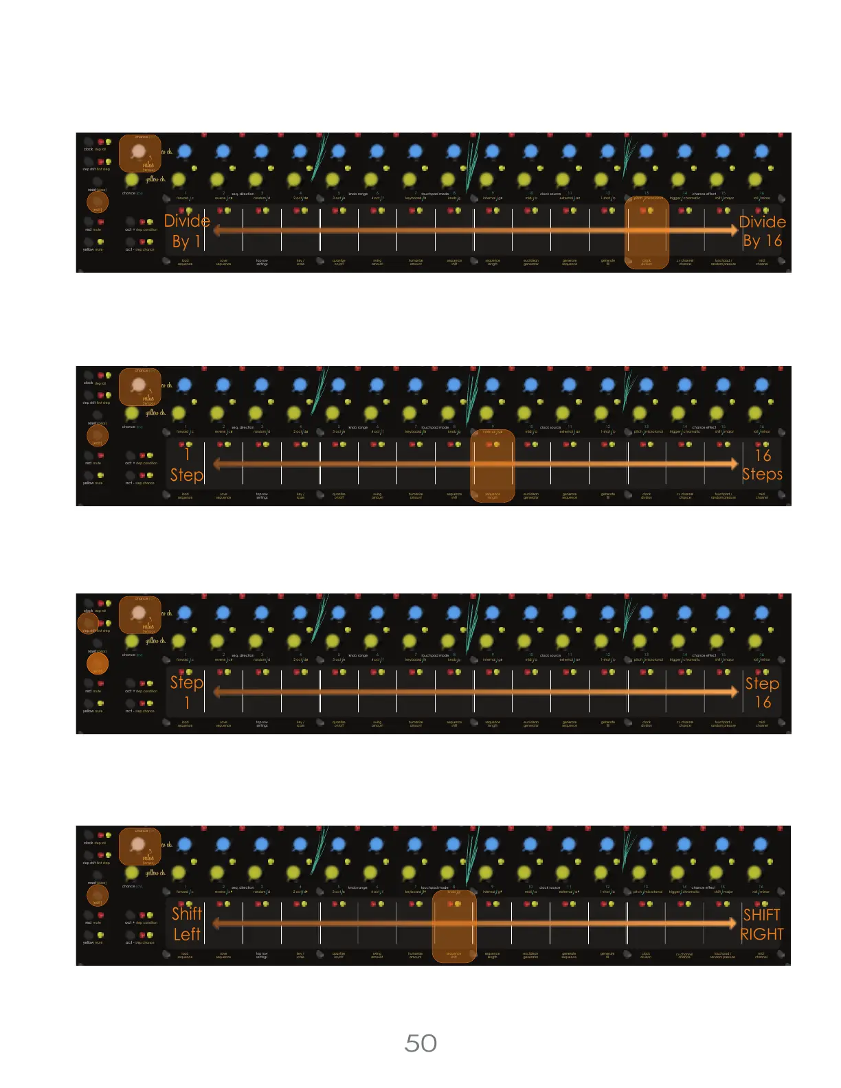 Clock Division controls how many clock pulses are equal to one step for the sequencer. To set the Clock Division, hold