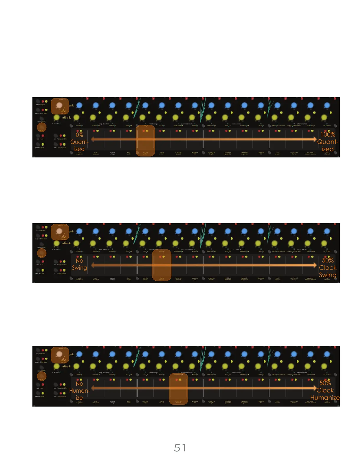 Humanize Timing adds random timing shifts to every step in a sequence. To set the Humanize Timing, hold the [EDIT