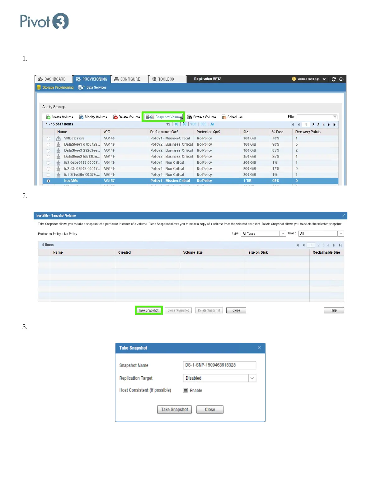 button next to the volume to receive a snapshot with replication and click Snapshot Volume.