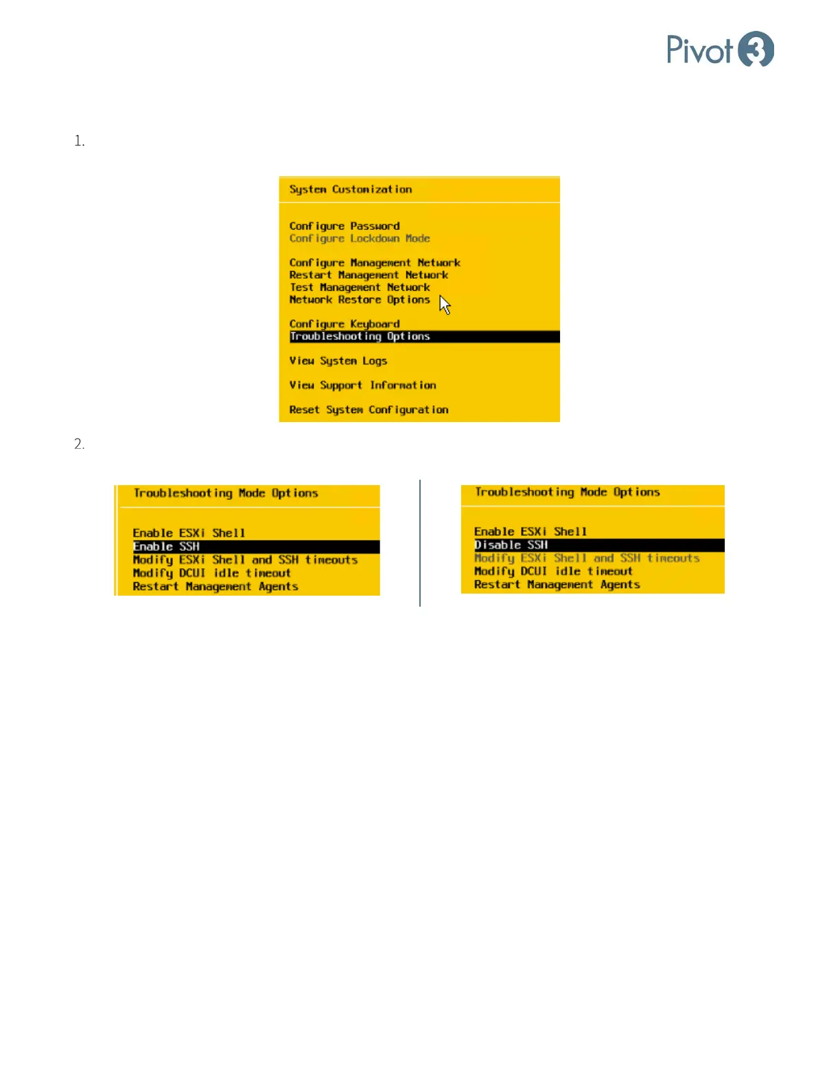 To Enable or Disable SSH, log in to the main ESXi screen and use the arrow keys to navigate to