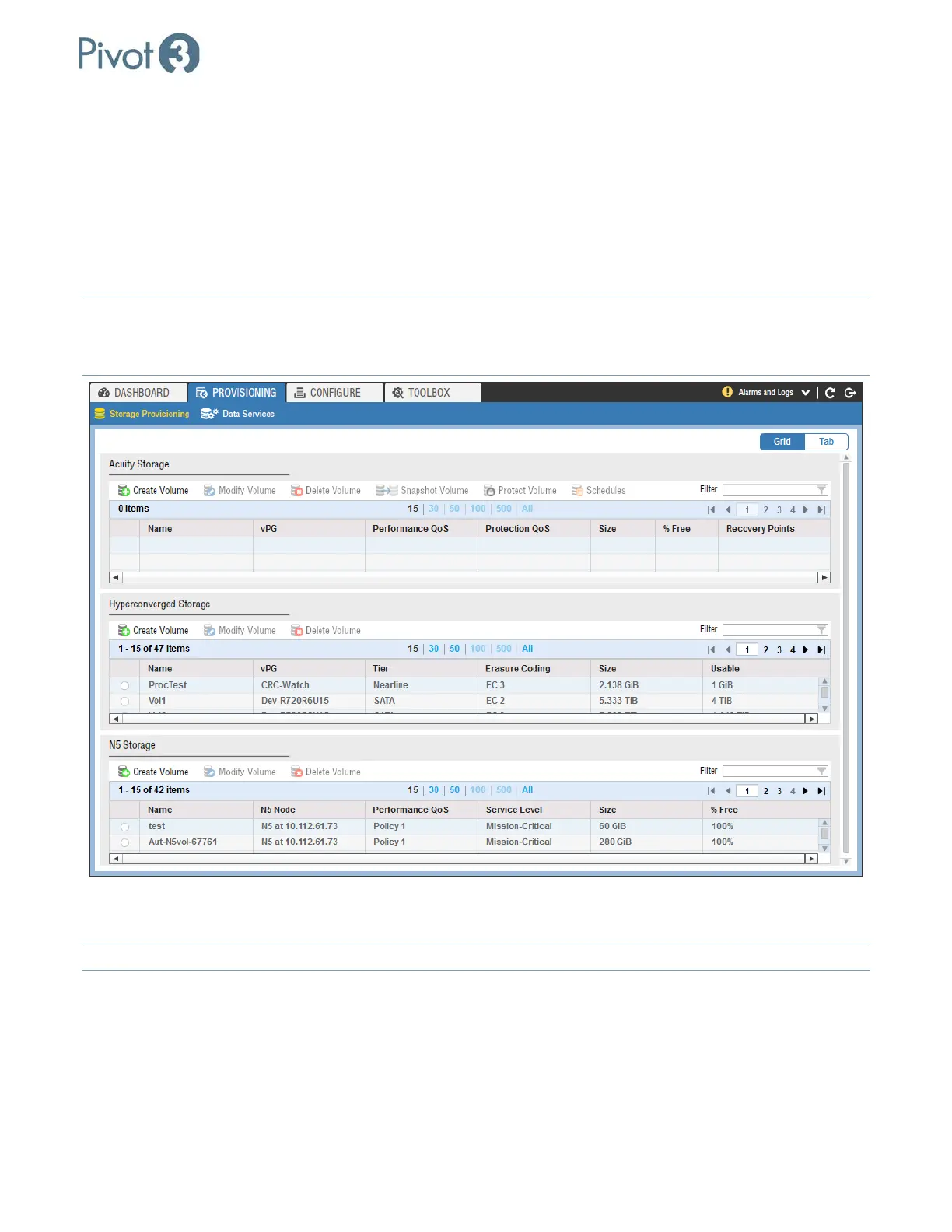view. Grid view provides an overview of all storage available, whether set up in Acuity or vSTAC environments; Tab