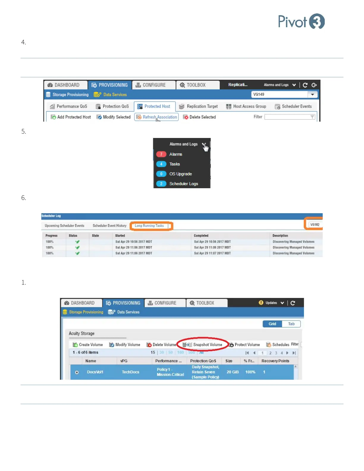 To create a snapshot of a volume, navigate to the Provisioning tab’s Storage Provisioning view. Click the radio