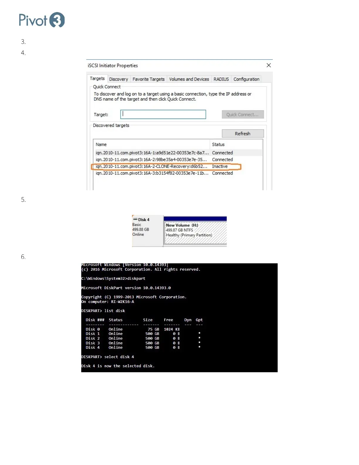Discover the new volume and log in via iSCSI Initiator. The new volume will initially show up as Inactive.