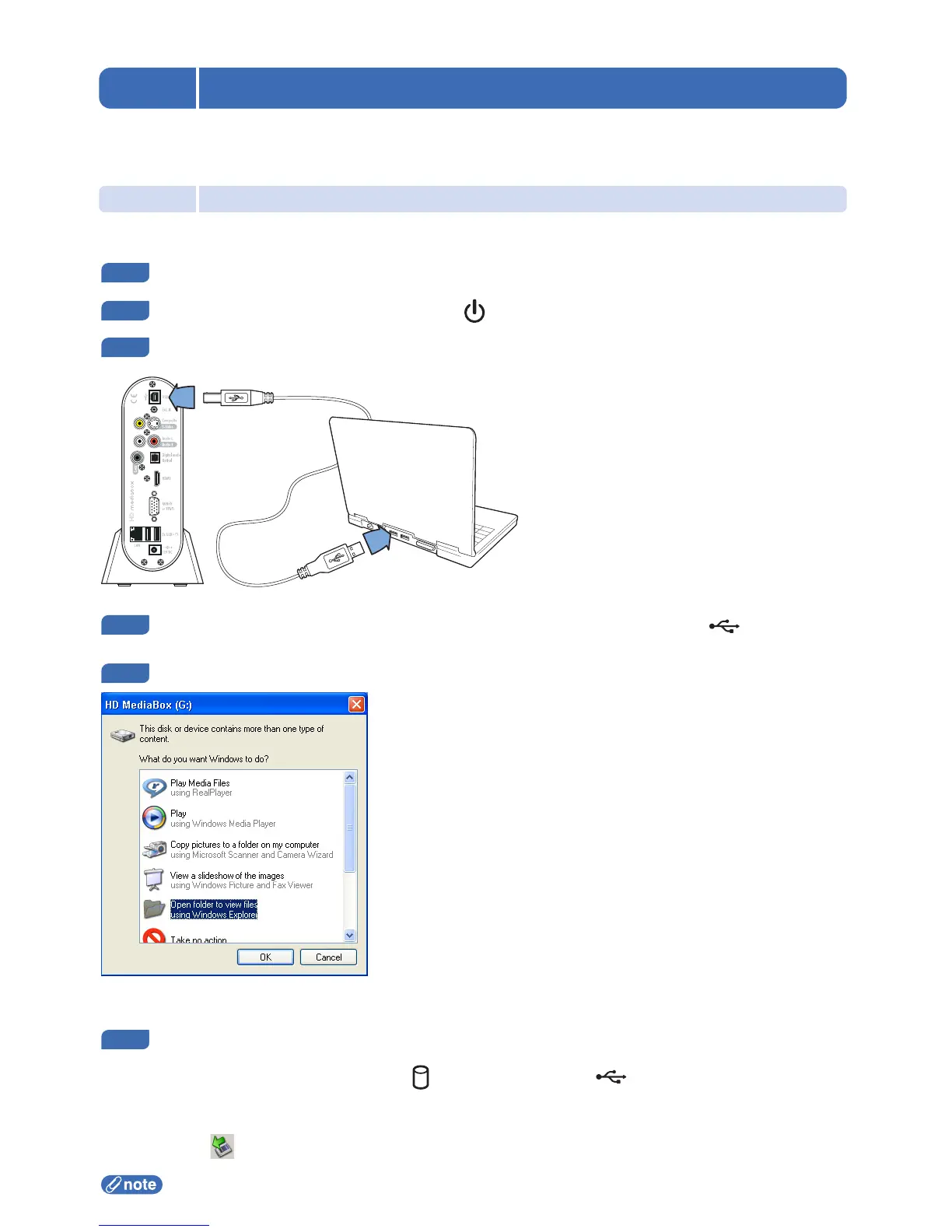 the front panel of HD MediaBox will light to show the presence of a USB connection.