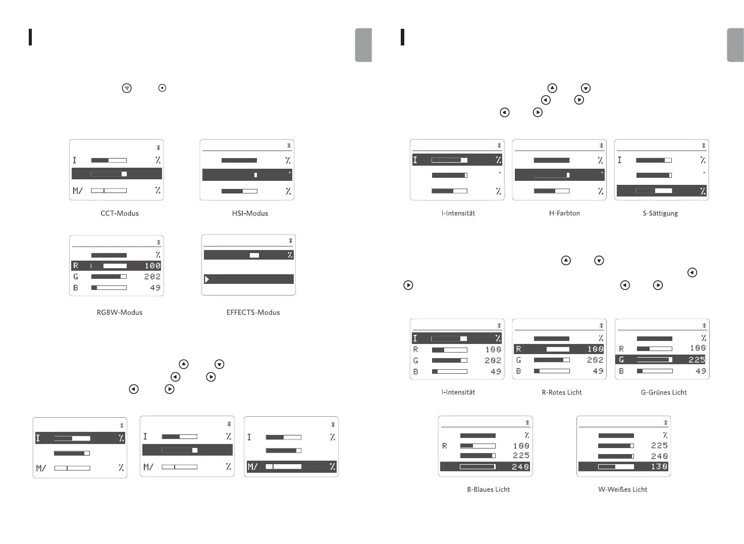 Drücken Sie kurz die Taste [ ] oder [ ], um zwischen CCT-Modus, HSI-Modus, RGBW-Mo-