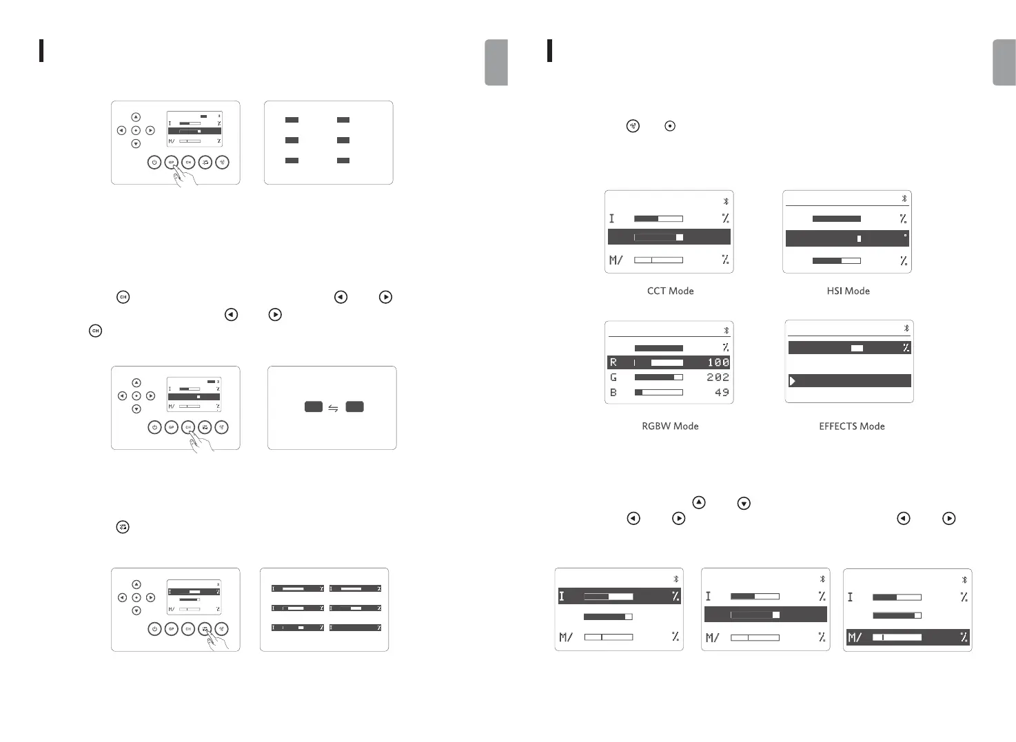 Short press the [ ] or [ ] button to cycle through CCT mode, HSI mode, RGBW mode and