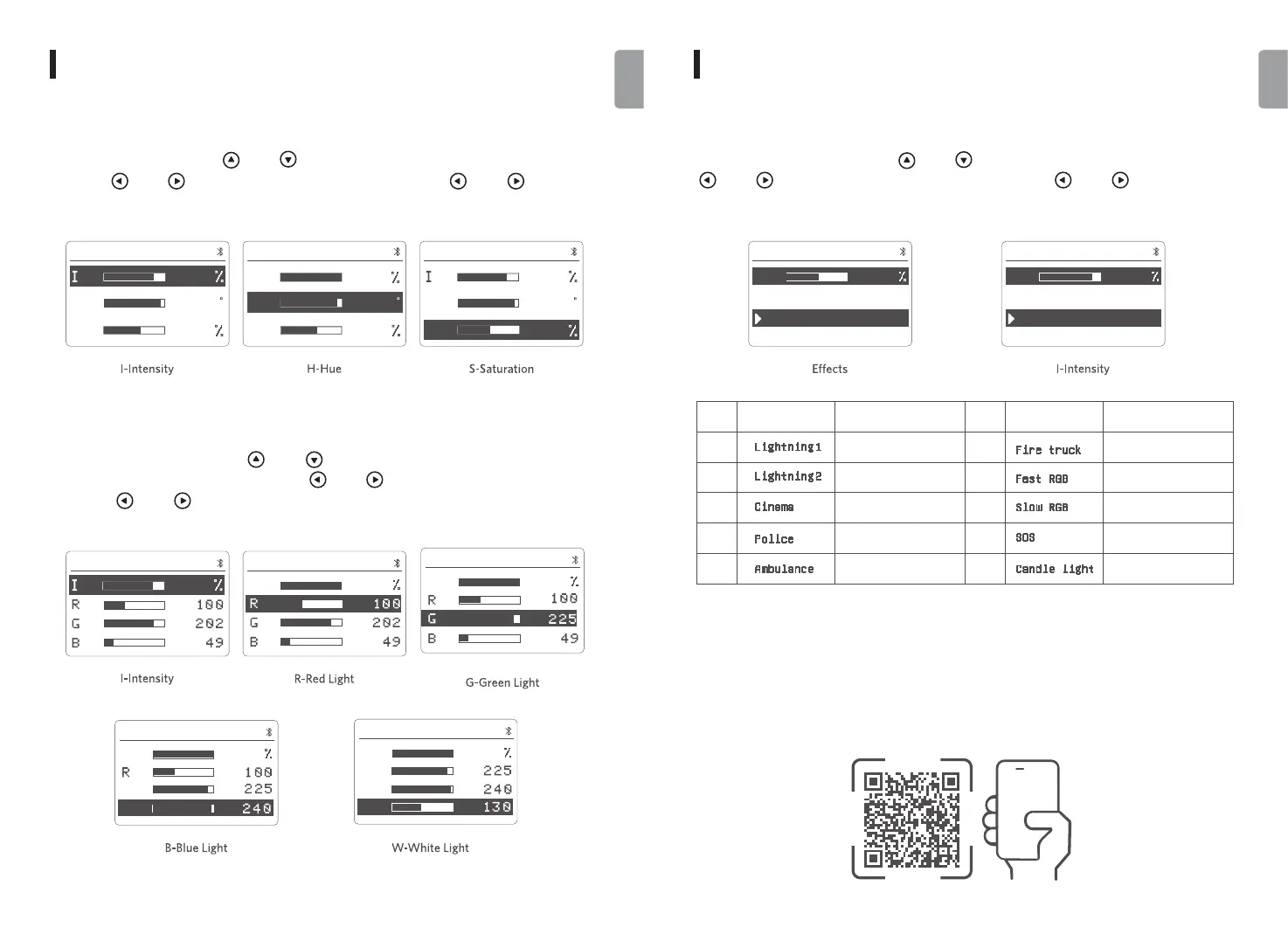 In HSI mode, short press the [ ] and [ ] button to set intensity, hue and saturation. Short