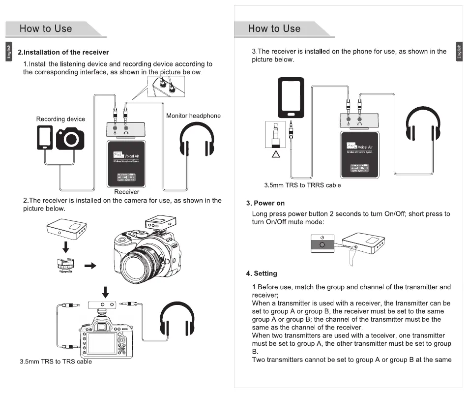 Pixel Voical Air - Installation of the Receiver; Power on; Setting