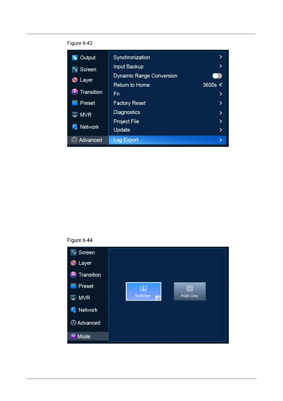Select Log Export to access the submenu. Select Apply to export the log files to the