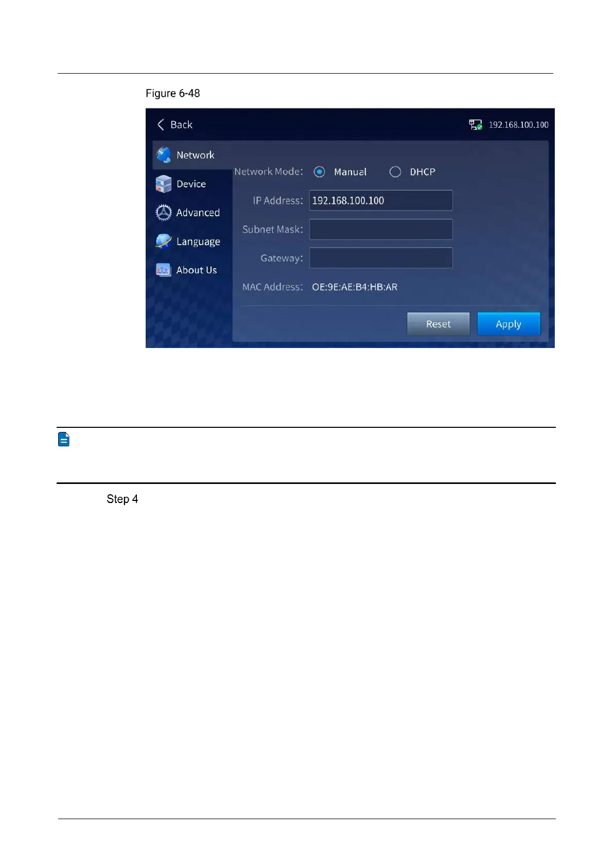 The device supports both automatic (DHCP) and manual IP configuration. When the